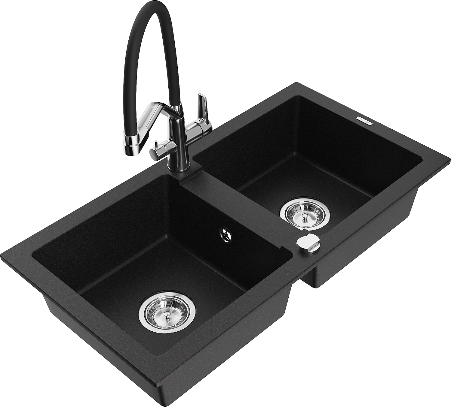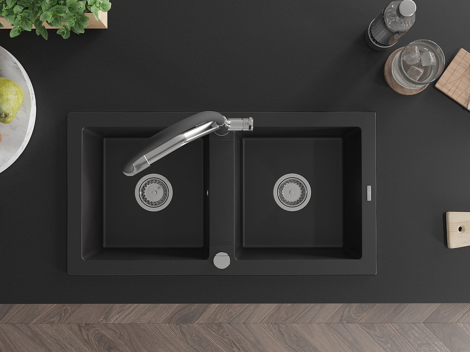 Mexen Mario chiuvetă de bucătărie din granit cu 2 compartimente și baterie Duo, negru - 6504-77-671701-07