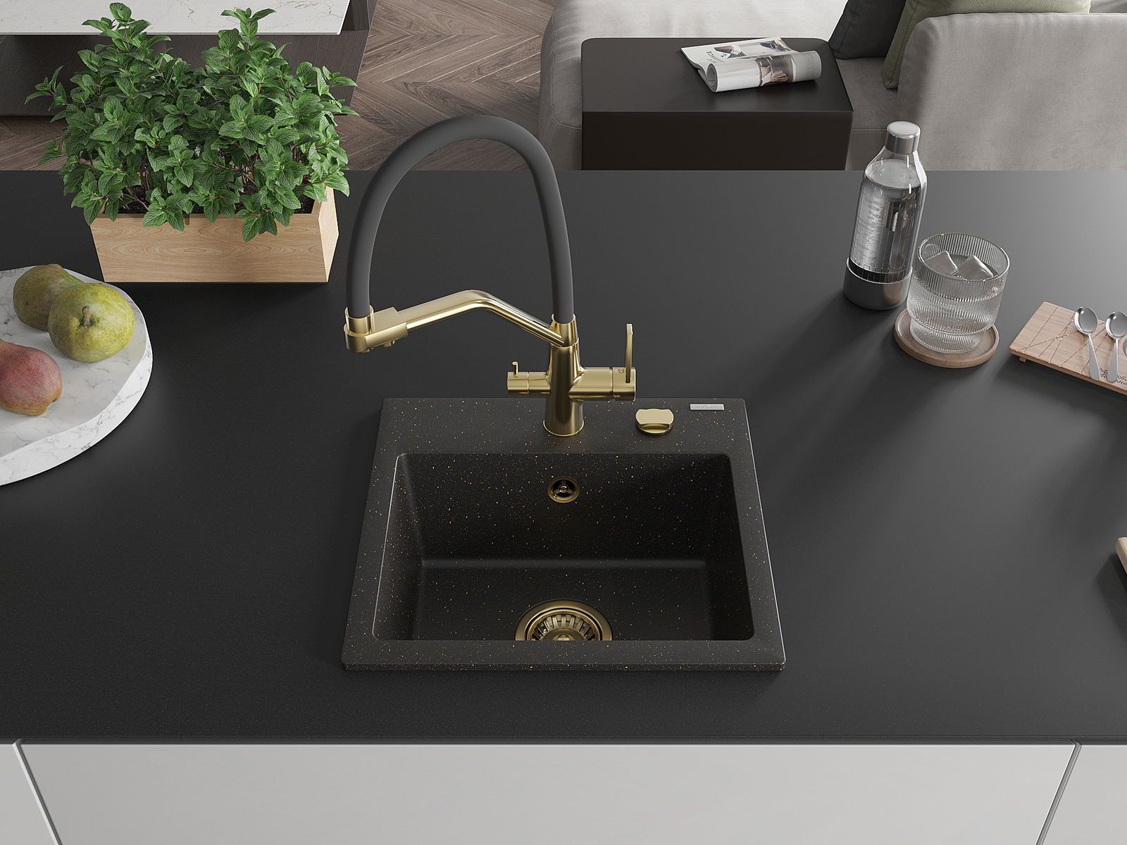 Mexen Milo chiuvetă de bucătărie din granit cu 1 compartiment și baterie Duo, negru/auriu metalizat - 6505-75-671701-57-G