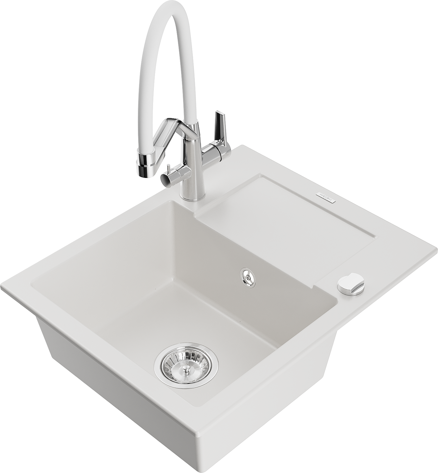 Mexen Enzo chiuvetă de granit cu 1 compartiment, cu scurgător și baterie de bucătărie Duo, alb - 6506-20-671701-02