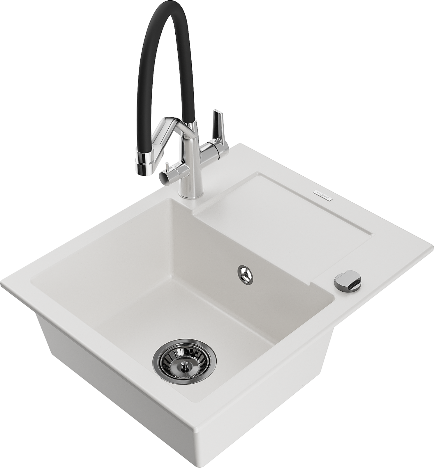 Mexen Enzo chiuvetă de bucătărie din granit cu 1 cuvă cu scurgător și baterie Duo, alb - 6506-20-671701-07-B