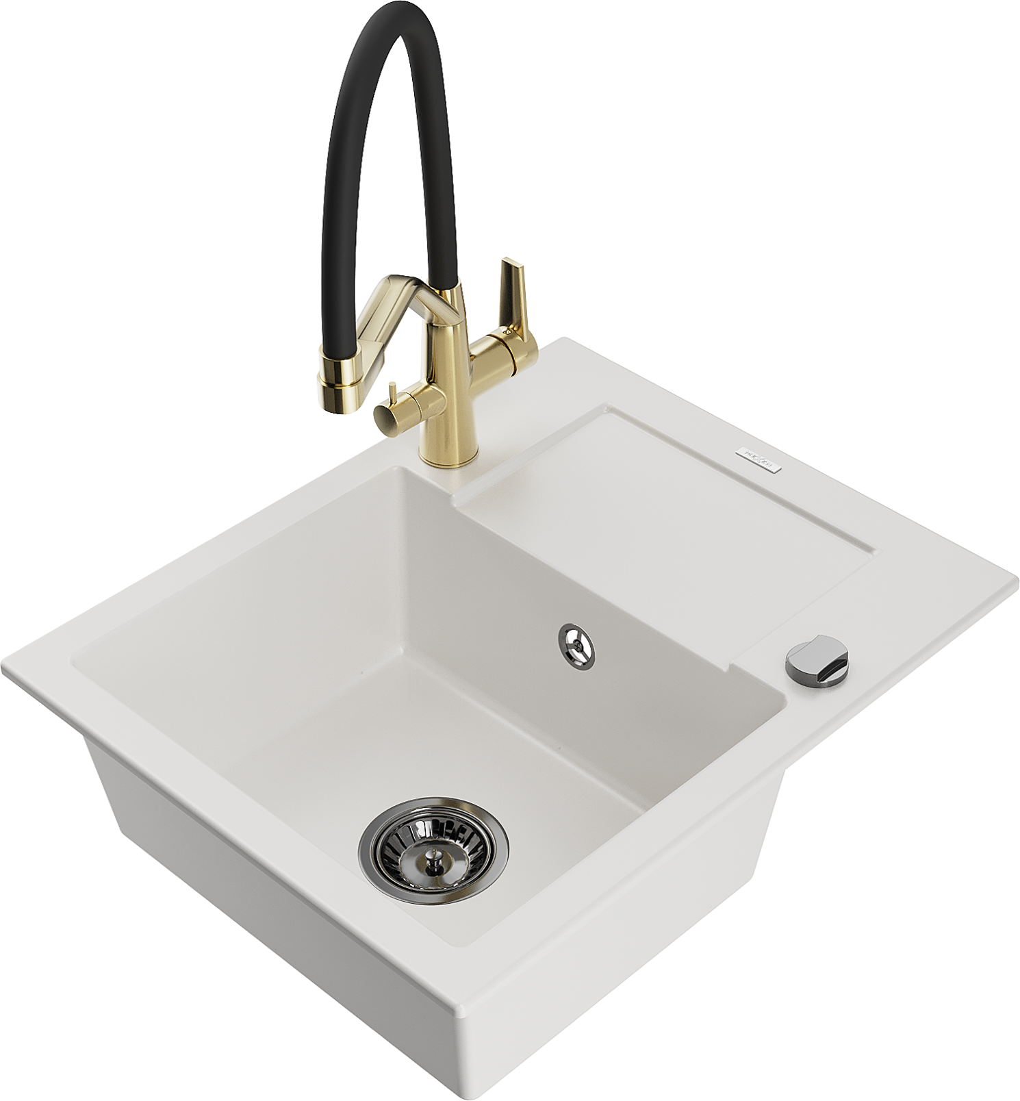 Mexen Enzo chiuvetă de granit cu 1 compartiment și scurgător și baterie de bucătărie Duo, alb - 6506-20-671701-57-B