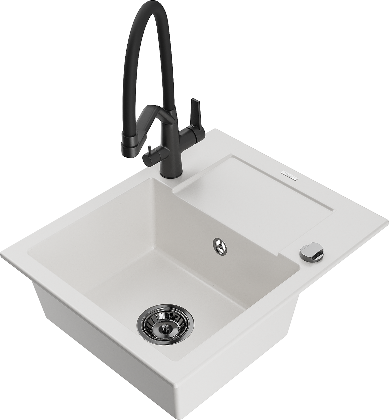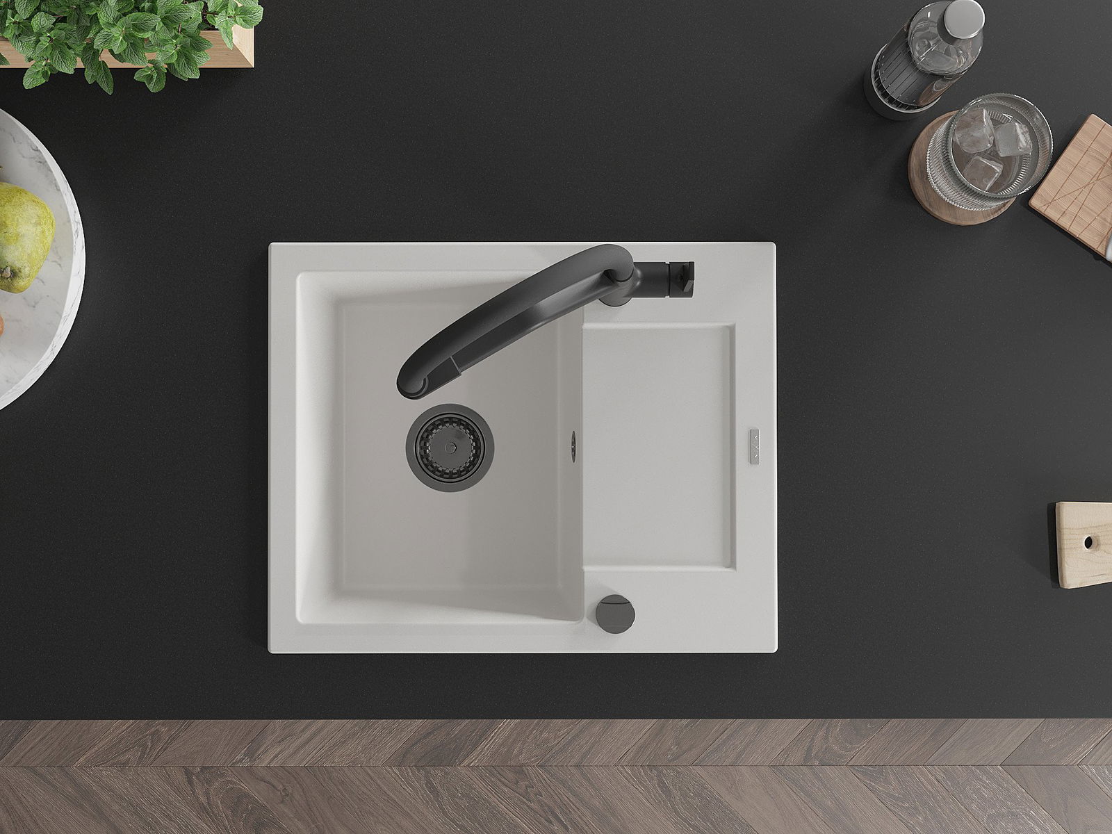 Mexen Enzo chiuvetă de granit cu 1 cuvă și scurgător și baterie de bucătărie Duo, alb - 6506-20-671701-70-B