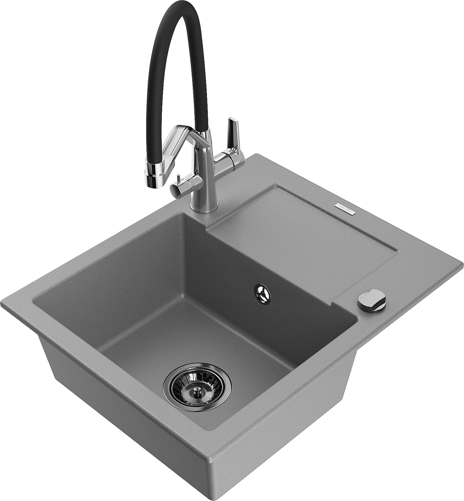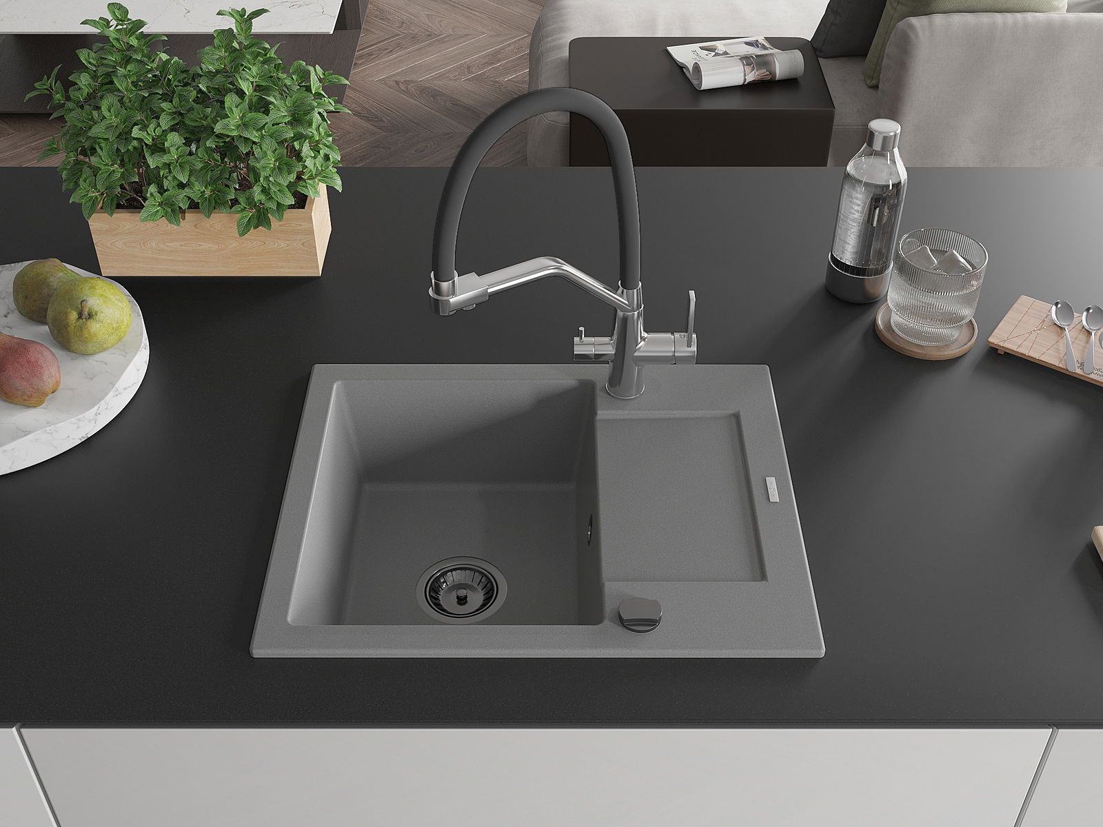Mexen Enzo chiuvetă de granit cu 1 cuvă cu picurător și baterie bucătărie Duo, gri - 6506-71-671701-07-B