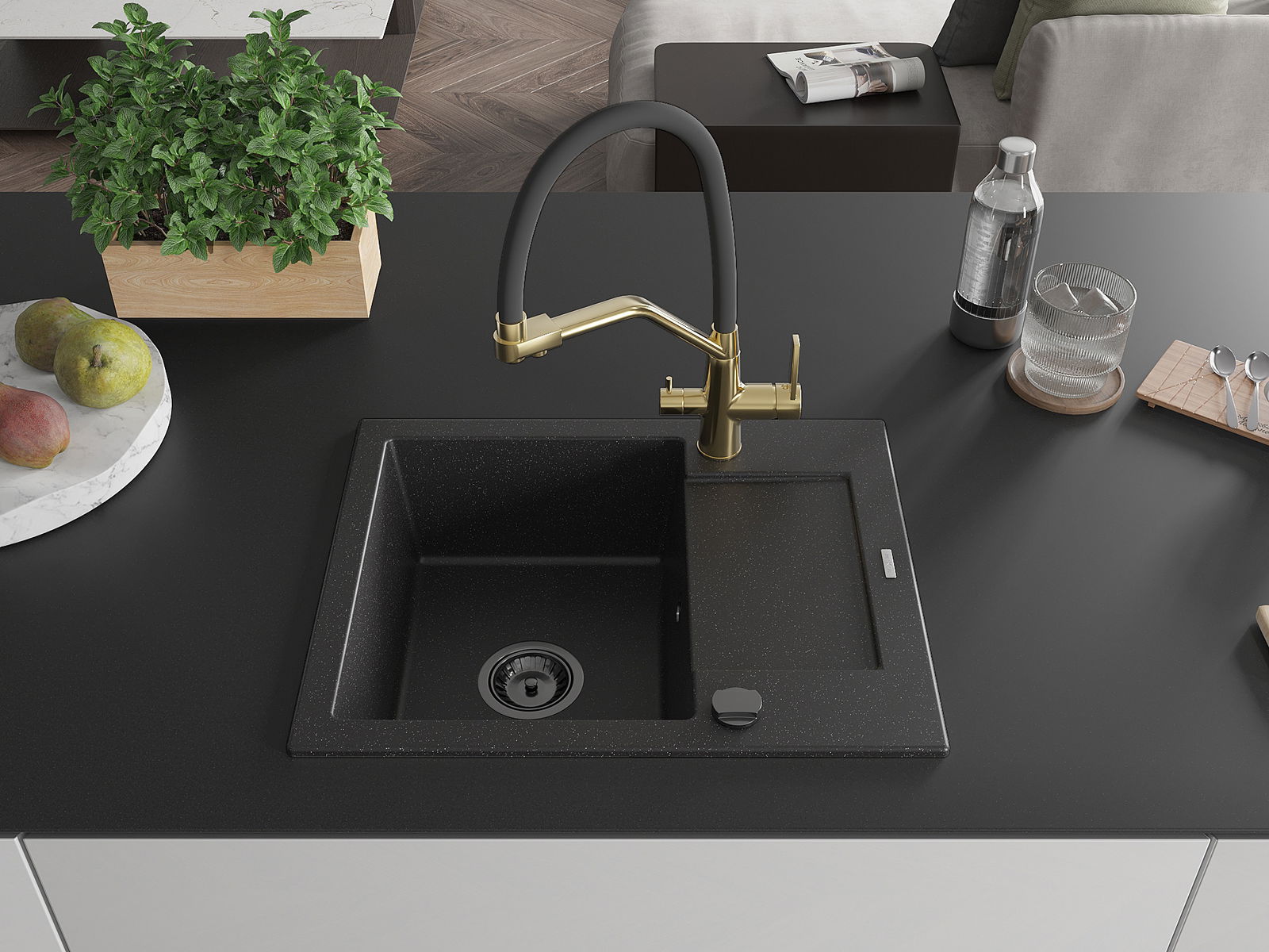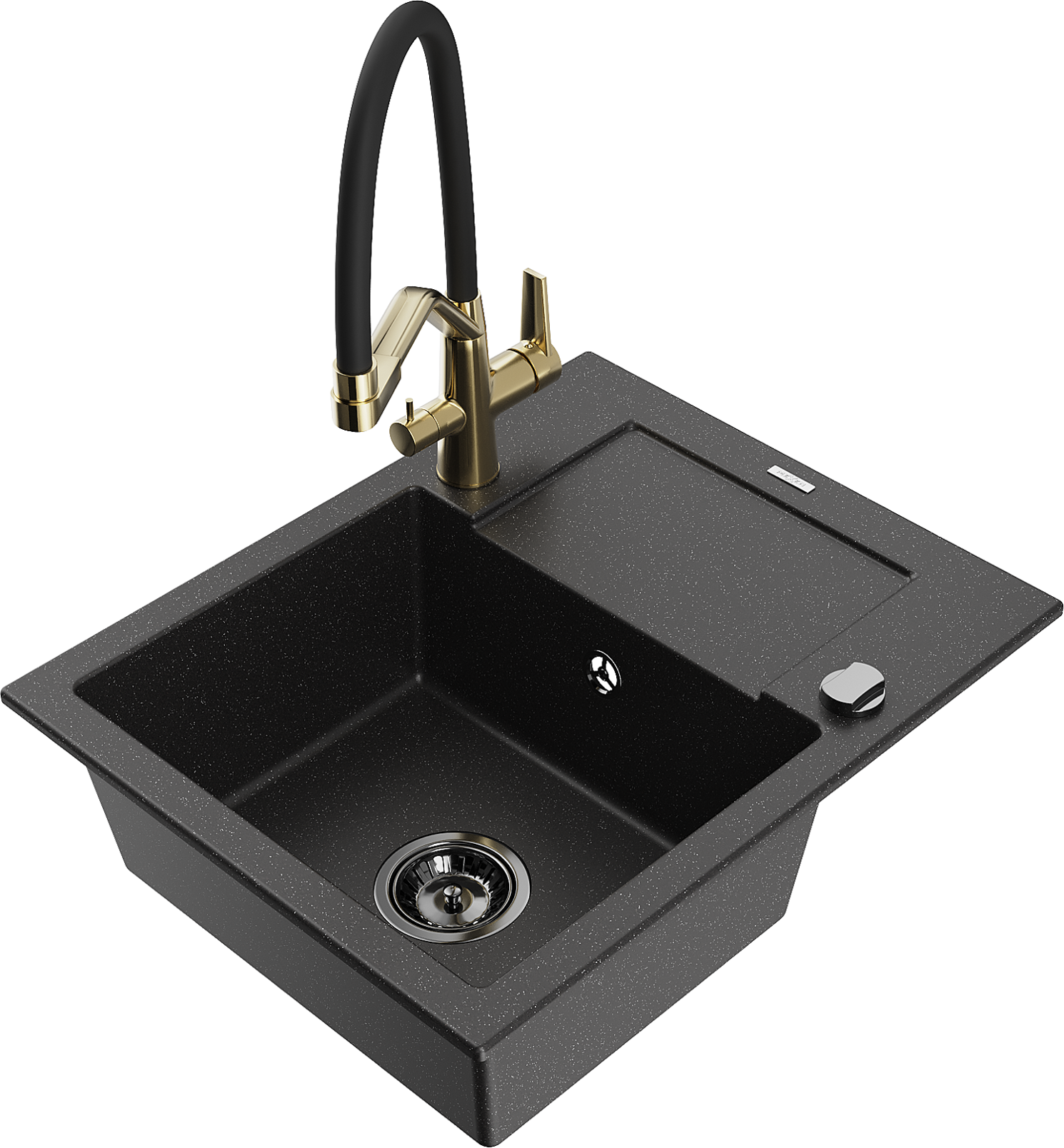 Mexen Enzo chiuvetă din granit cu 1 compartiment cu scurgător și baterie de bucătărie Duo, negru/argintiu metalic