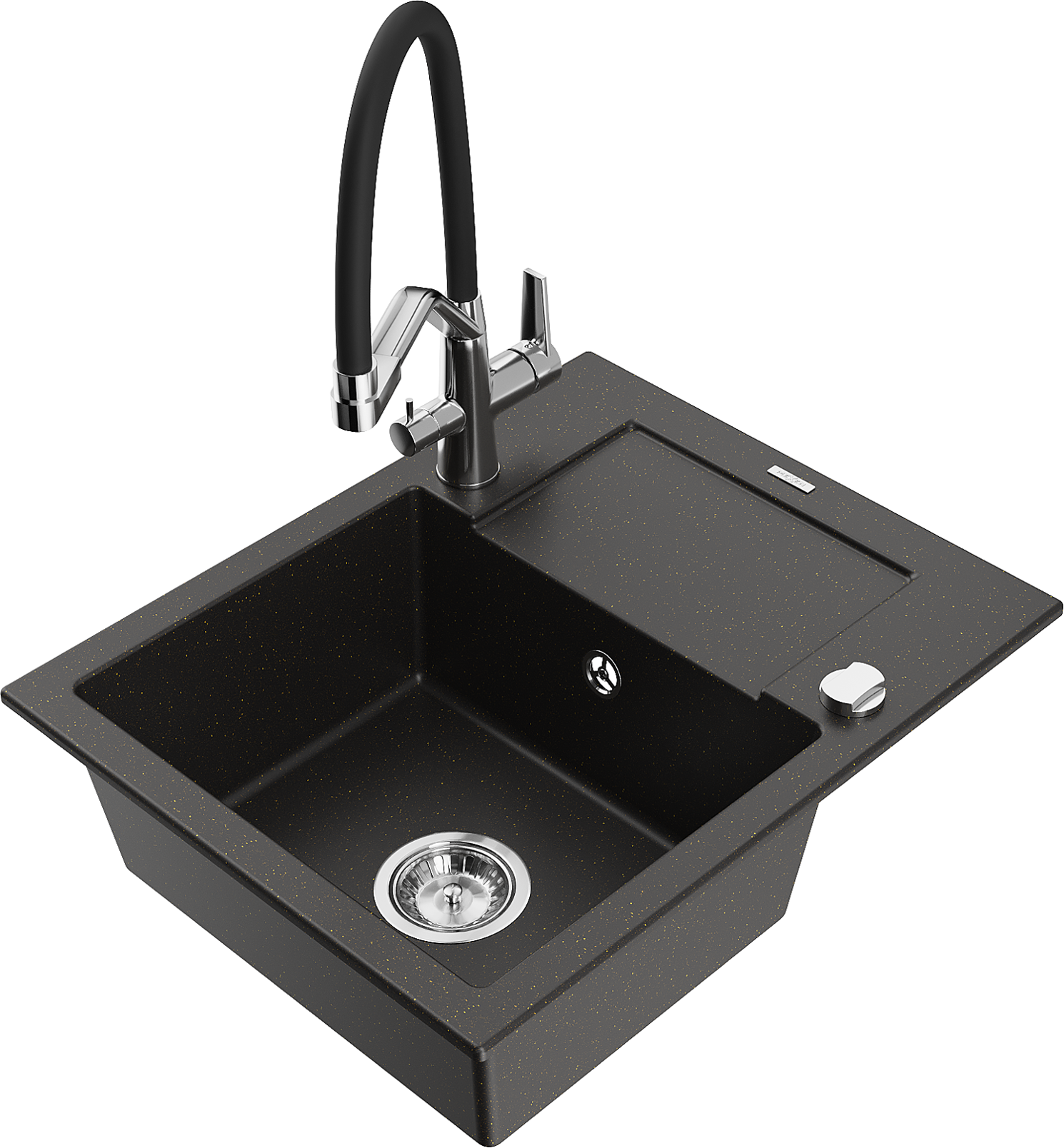 Mexen Enzo chiuvetă de granit cu o cuvă, cu scurgător și baterie de bucătărie Duo, negru/auriu metalizat - 6506-75-671701-07