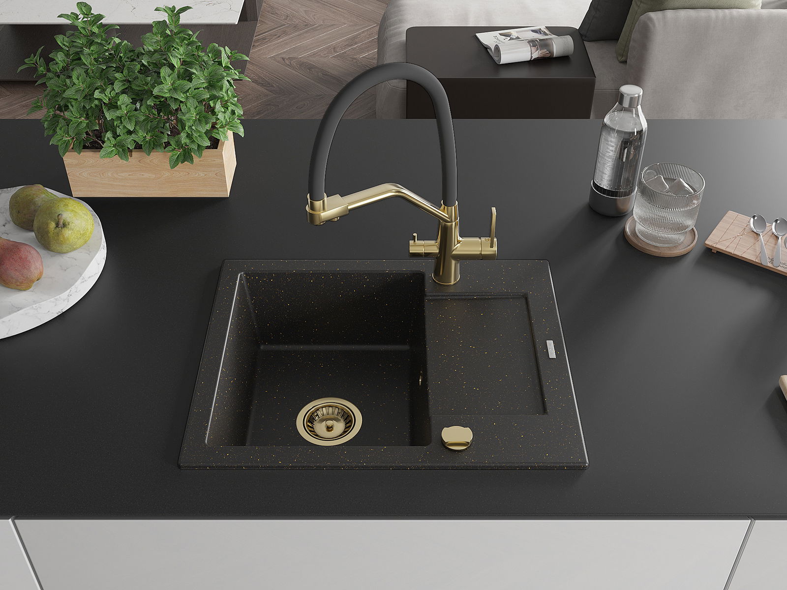 Mexen Enzo chiuvetă de granit cu 1 compartiment cu picurător și baterie de bucătărie Duo, negru/auriu metalic