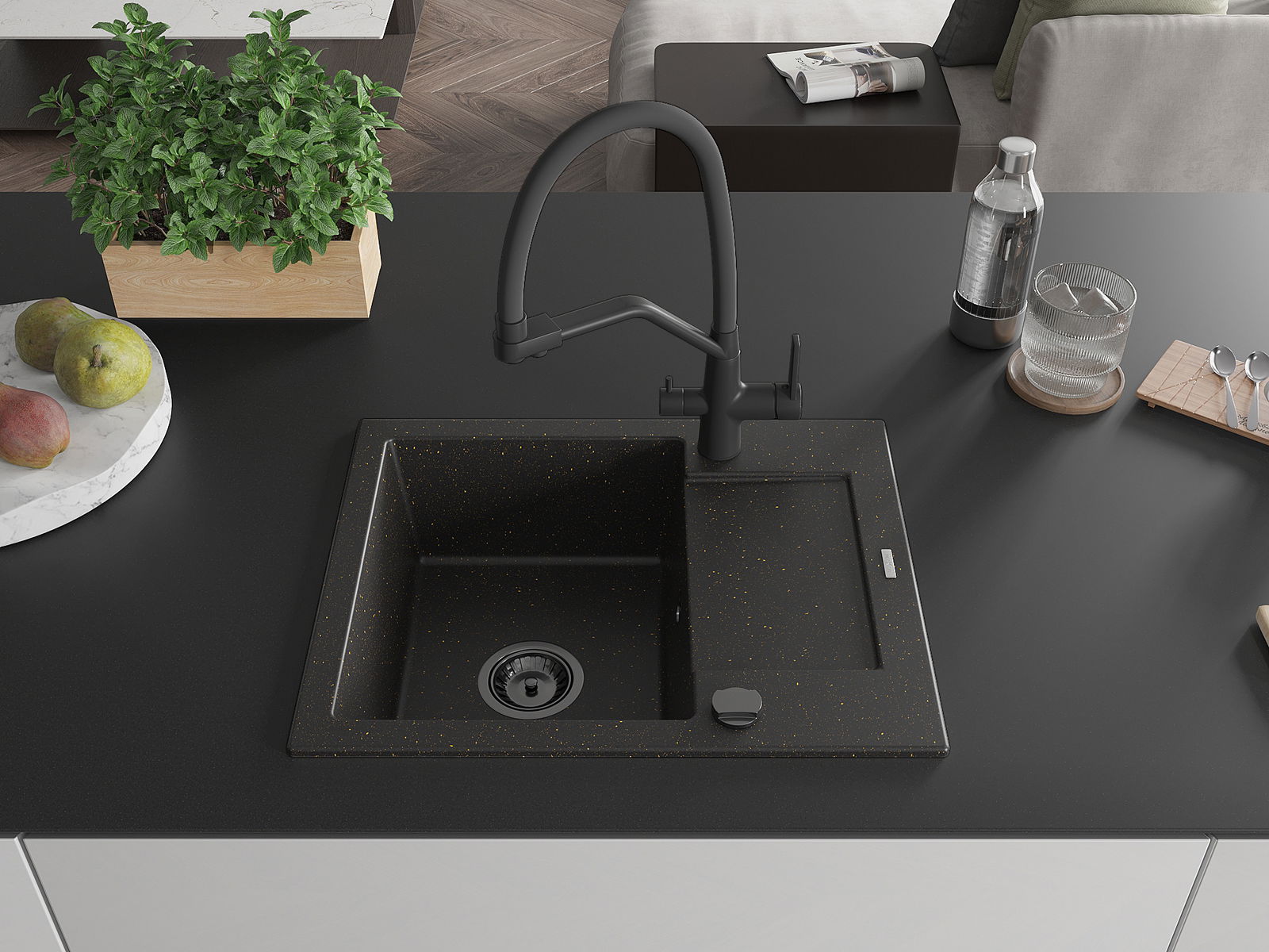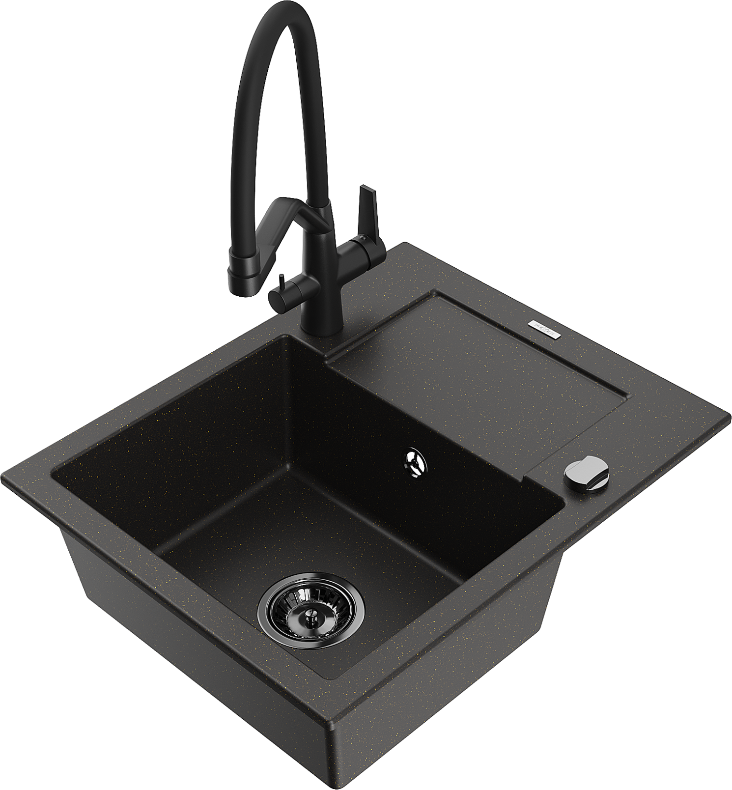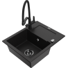 Mexen Enzo chiuvetă de granit cu o cuvă și scurgător, cu baterie de bucătărie Duo, negru/auriu metalic
