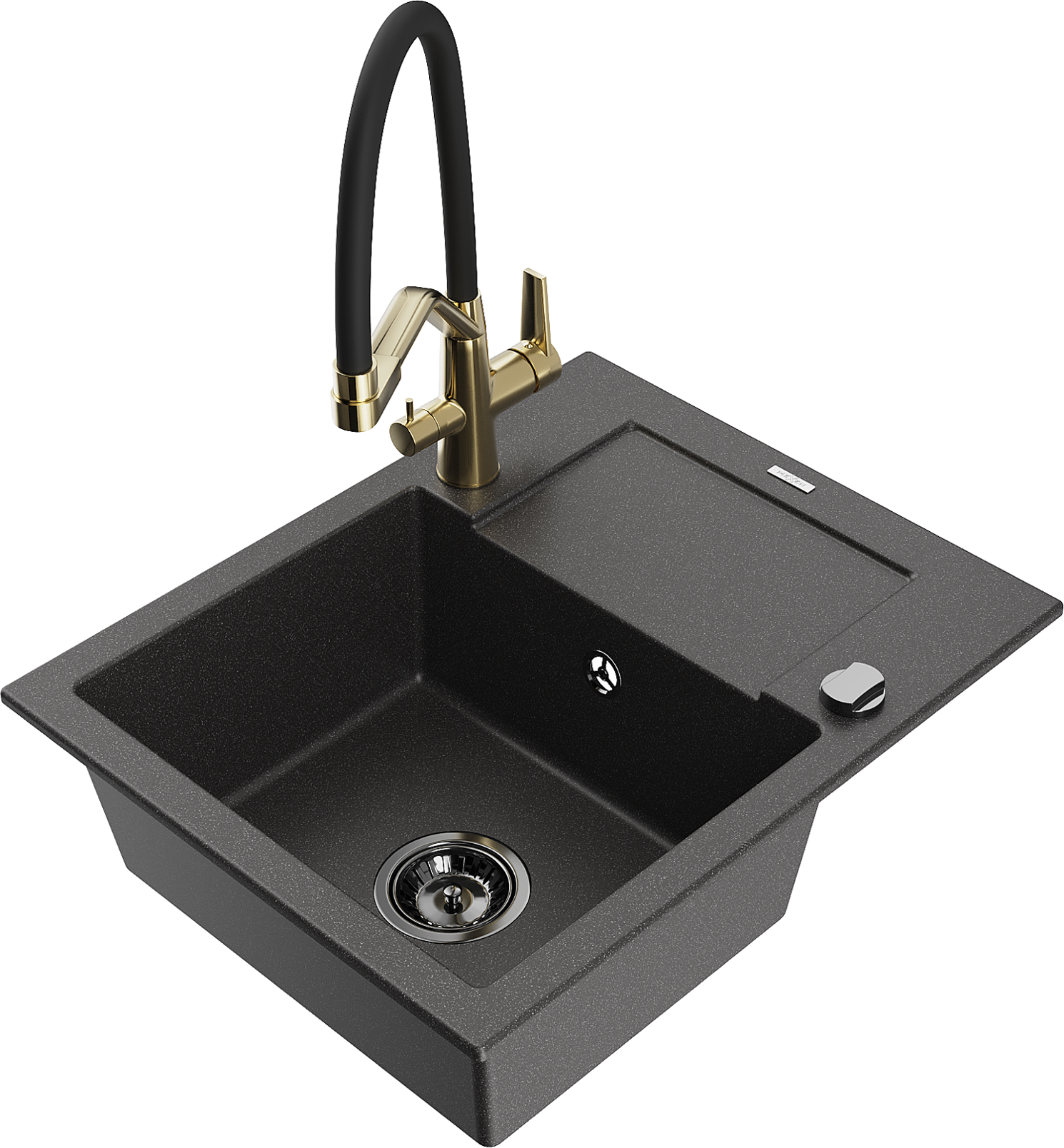 Mexen Enzo chiuvetă de bucătărie granit 1-cameră cu scurgător și baterie Duo, negru pătat - 6506-76-671701-57-B