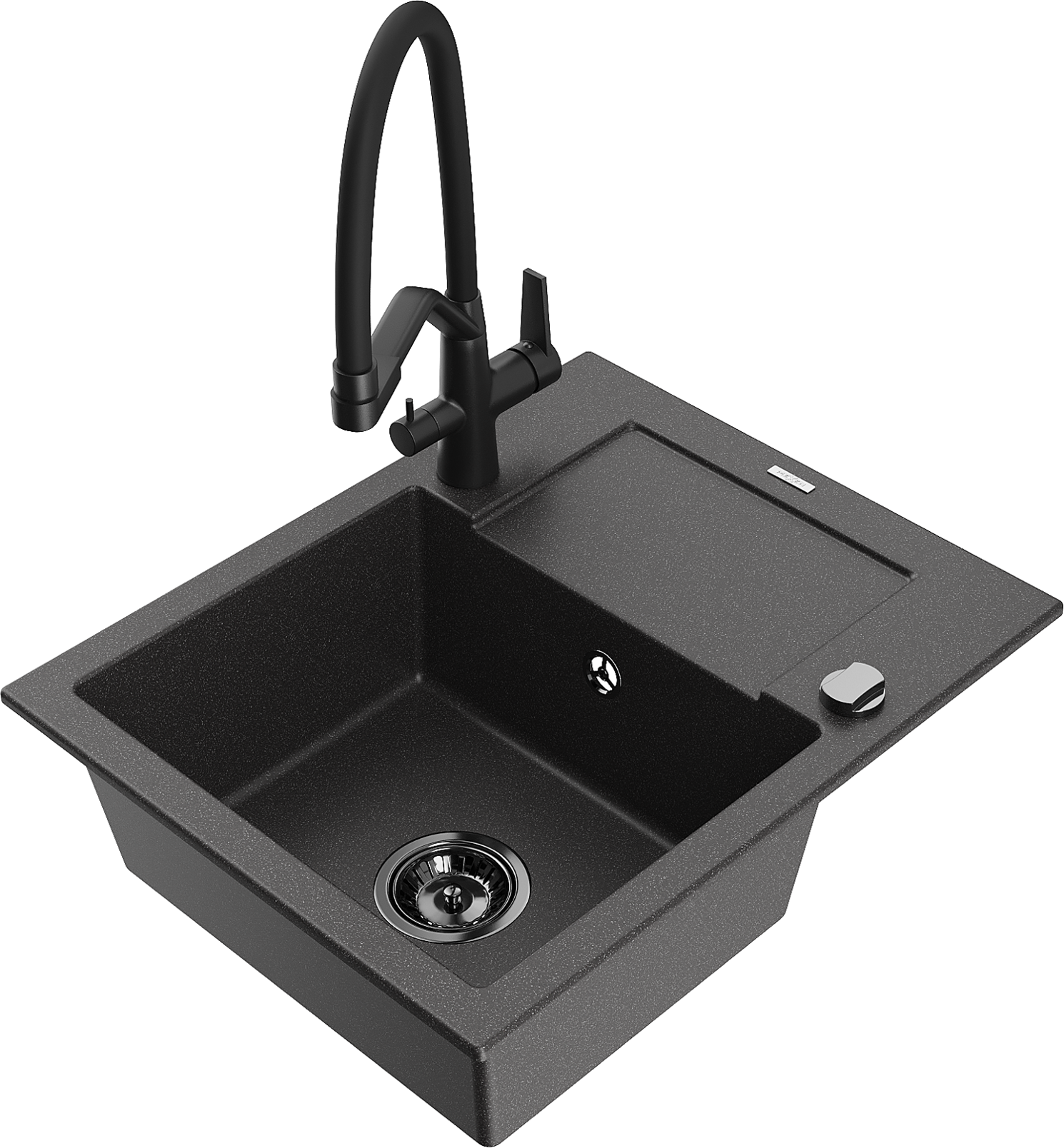 Mexen Enzo chiuvetă din granit cu 1 cuvă și scurgător și baterie de bucătărie Duo, negru pătat - 6506-76-671701-70-B