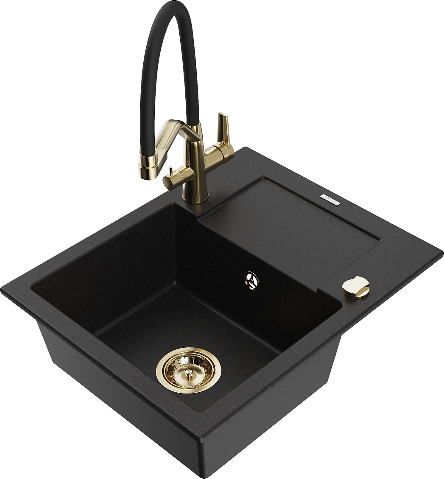 Mexen Enzo chiuvetă de bucătărie din granit cu 1 compartiment cu scurgător și baterie Duo, negru - 6506-77-671701-57-G