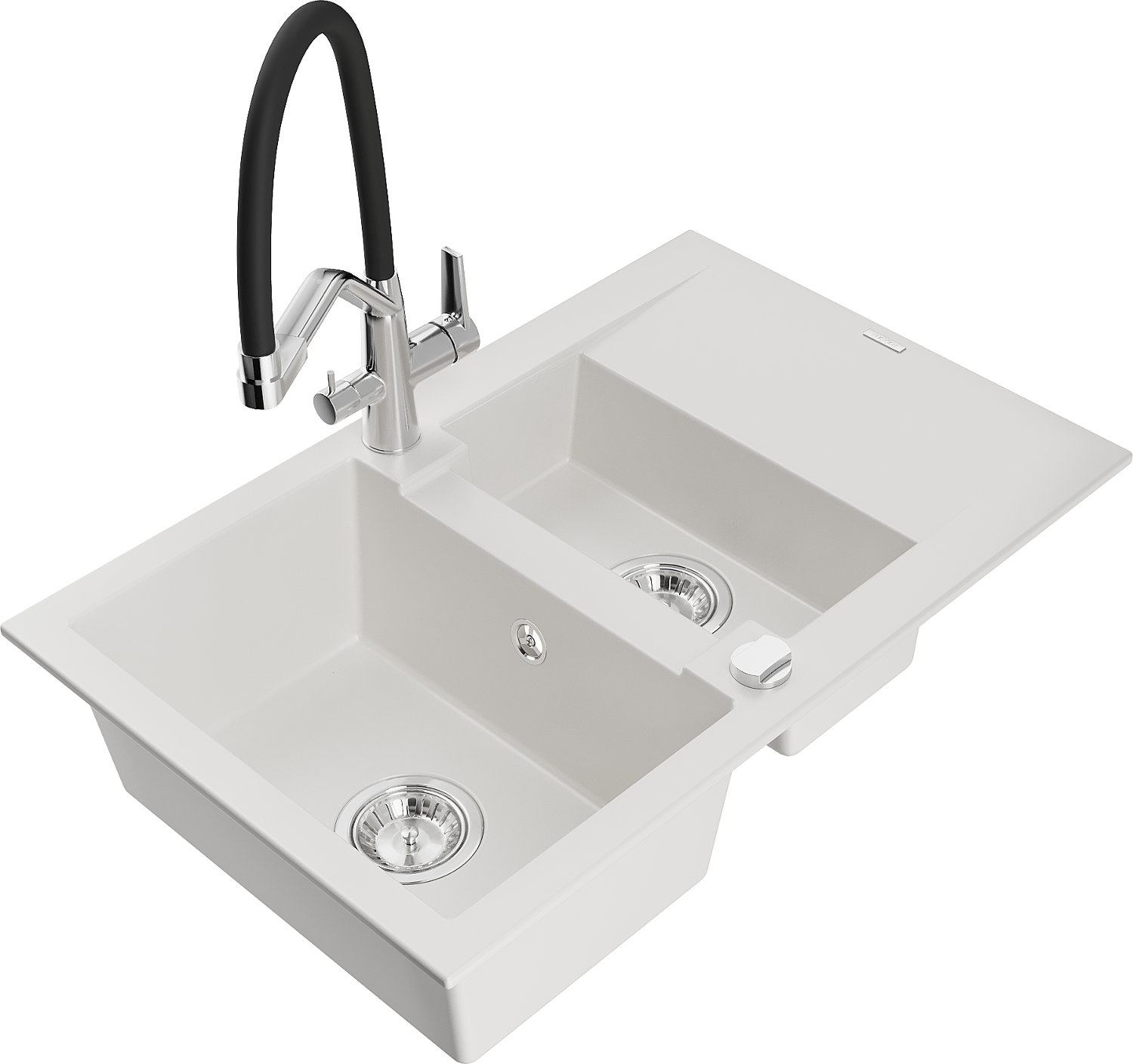 Mexen Gaspar chiuvetă granit 1,5 compartimente cu scurgător și baterie de bucătărie Duo, alb - 6507-20-671701-07
