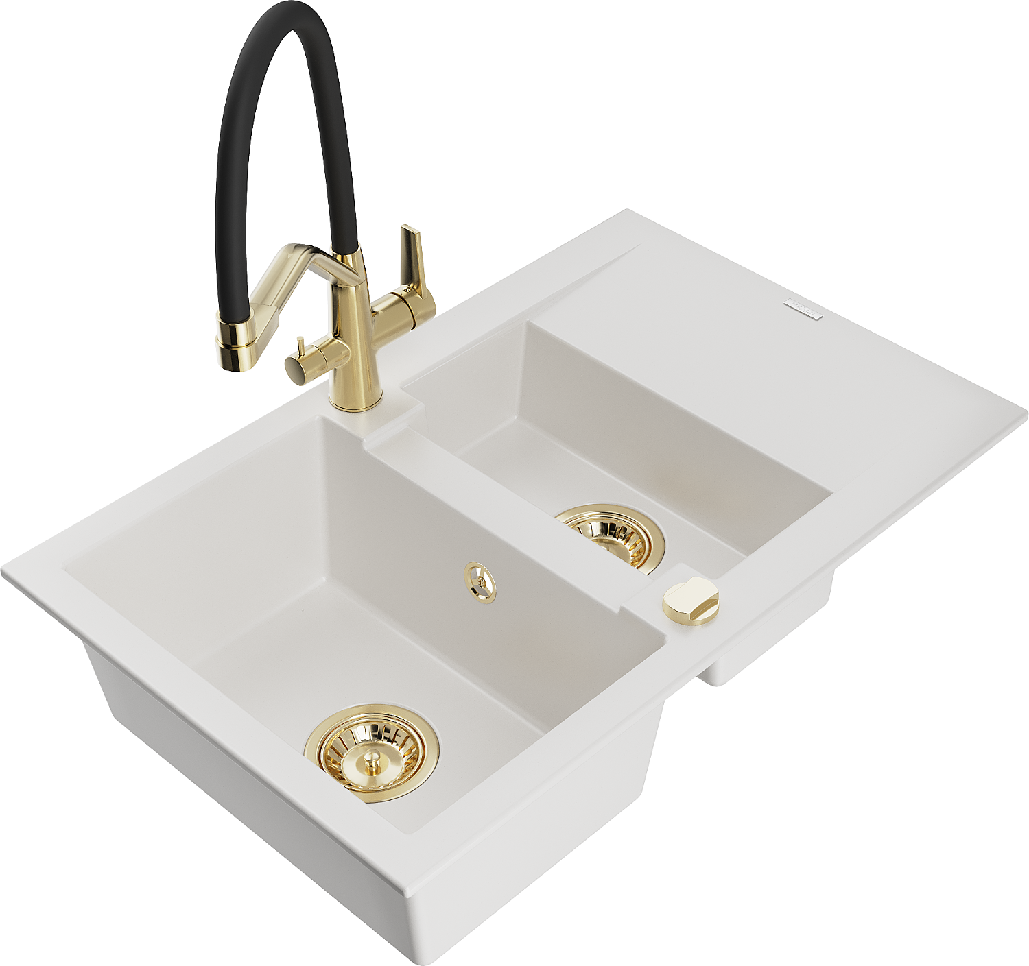 Mexen Gaspar chiuvetă de bucătărie din granit cu 1,5 compartimente cu picurător și baterie Duo, alb - 6507-20-671701-57-G