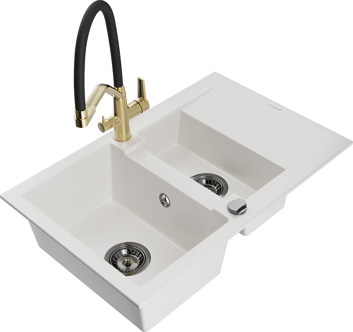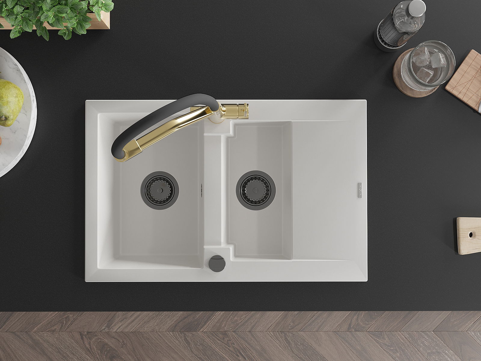 Mexen Gaspar chiuvetă de granit cu 1,5 compartimente cu picurător și baterie de bucătărie Duo, alb - 6507-20-671701-57-B