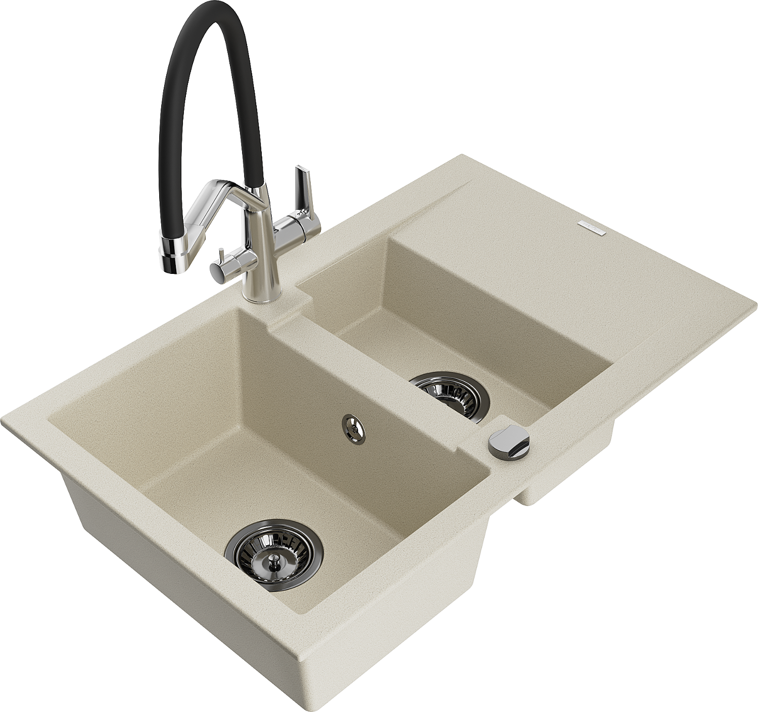 Mexen Gaspar chiuvetă de granit cu 1,5 compartimente și picurător și baterie de bucătărie Duo, bej - 6507-69-671701-07-B