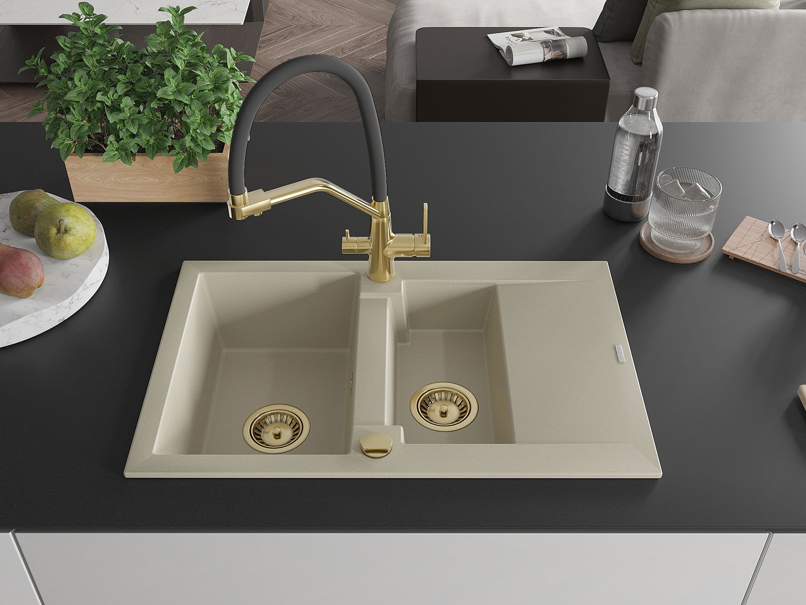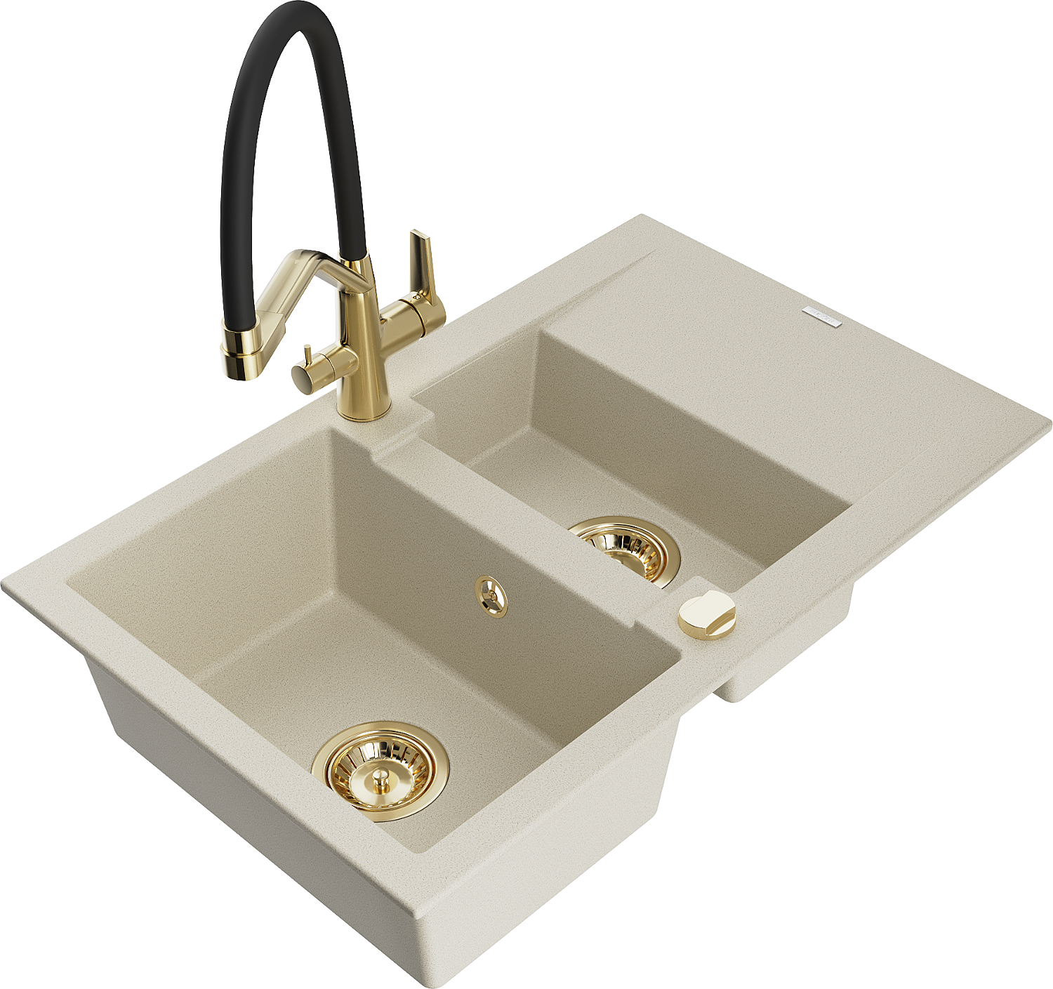 Chiuvetă granitică Mexen Gaspar cu 1,5 compartimente și picurător și baterie de bucătărie Duo, bej - 6507-69-671701-57-G
