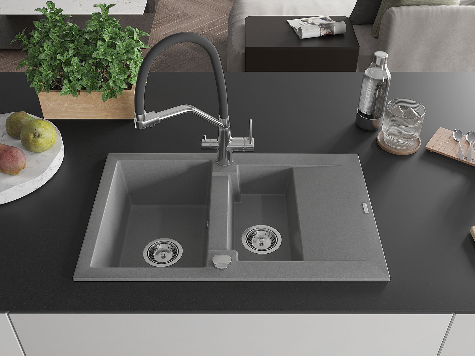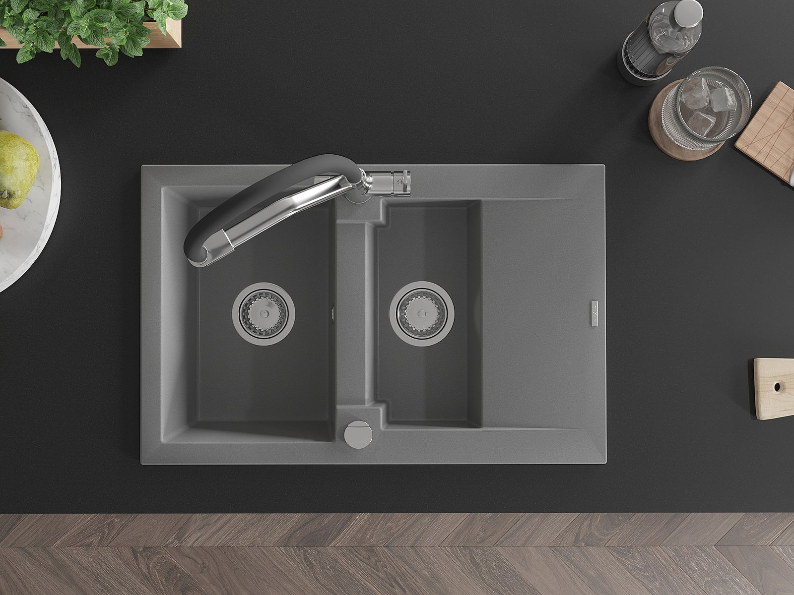 • Mexen Gaspar chiuvetă de bucătărie din granit cu 1,5 compartimente și baterie Duo, gri - 6507-71-671701-07