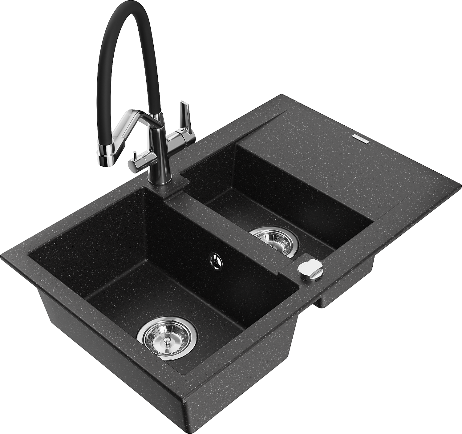 Mexen Gaspar chiuvetă de bucătărie din granit, cu 1,5 compartimente, cu scurgător și baterie Duo, negru/argintiu metalizat - 65?