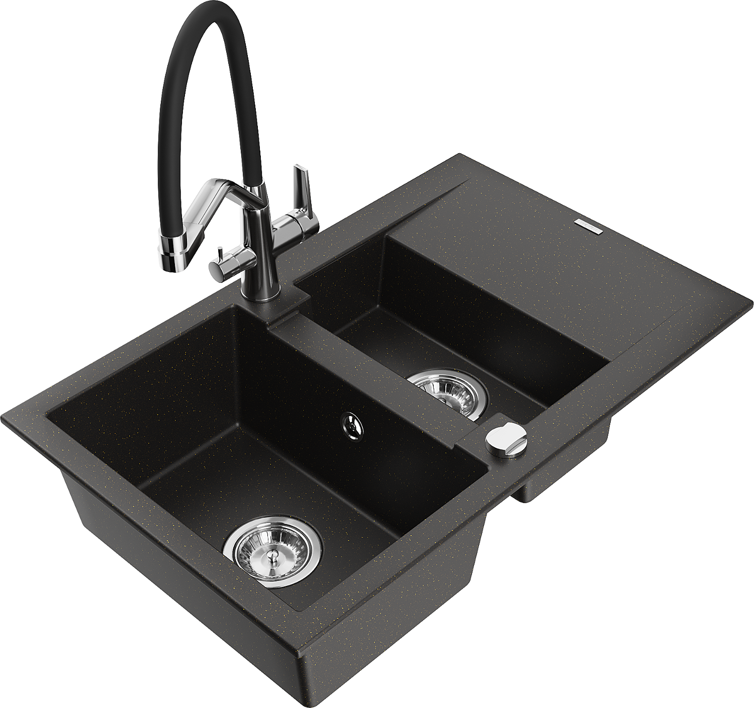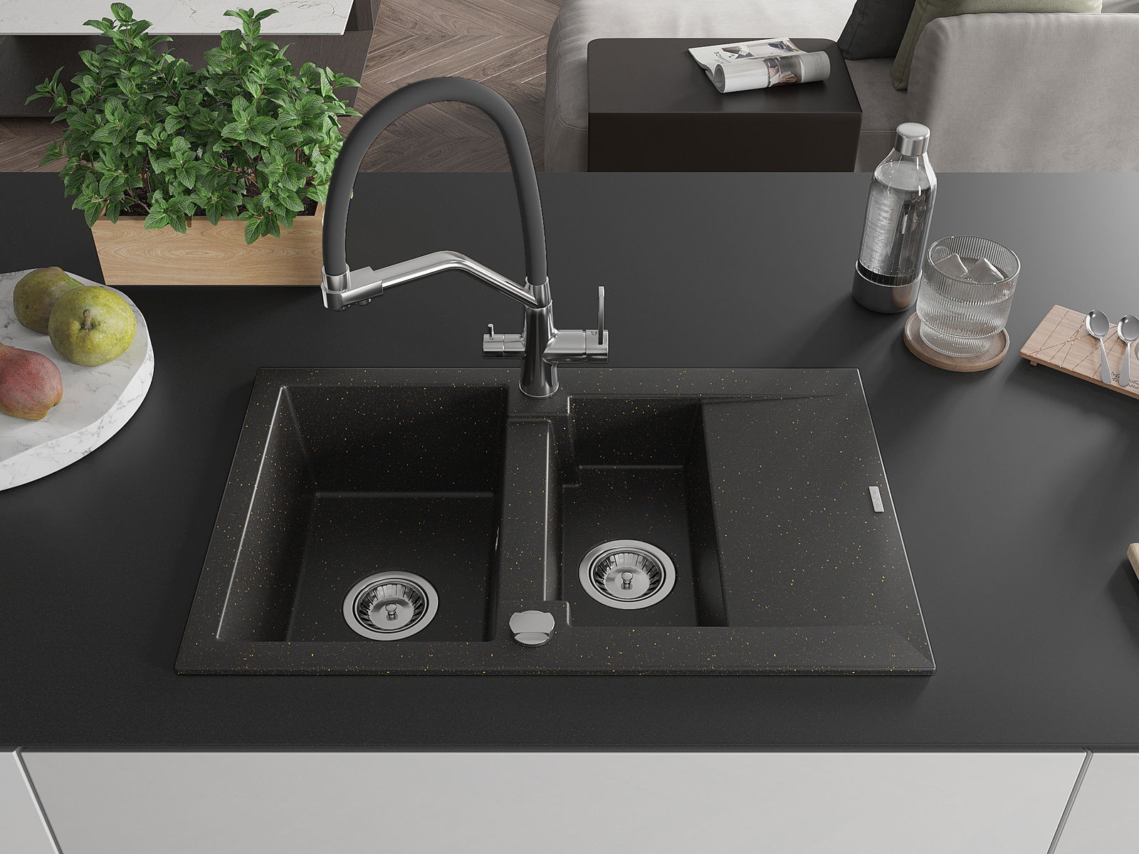 Mexen Gaspar chiuvetă din granit cu 1,5 cuve, cu picurător și baterie de bucătărie Duo, negru/auriu metalic