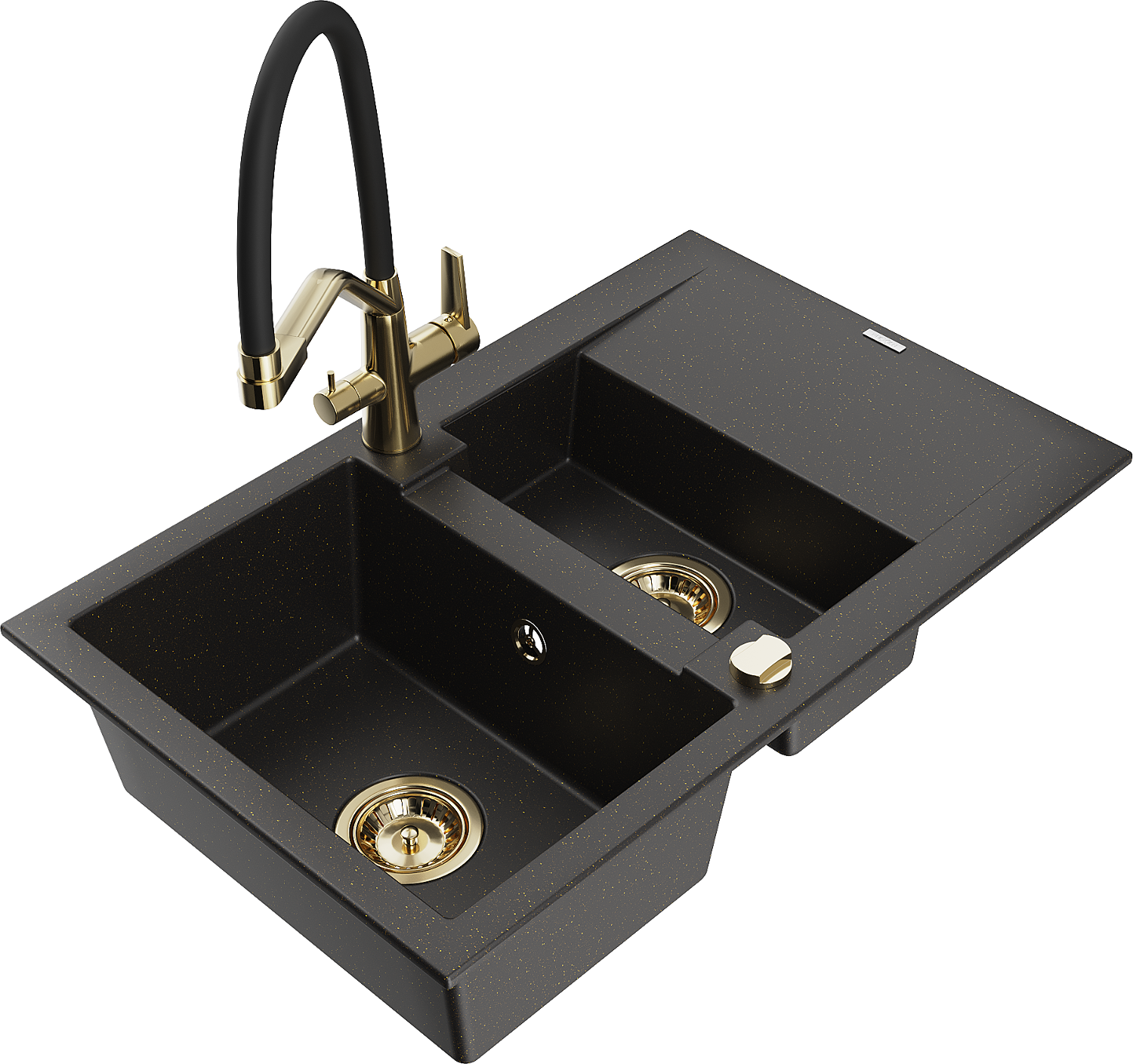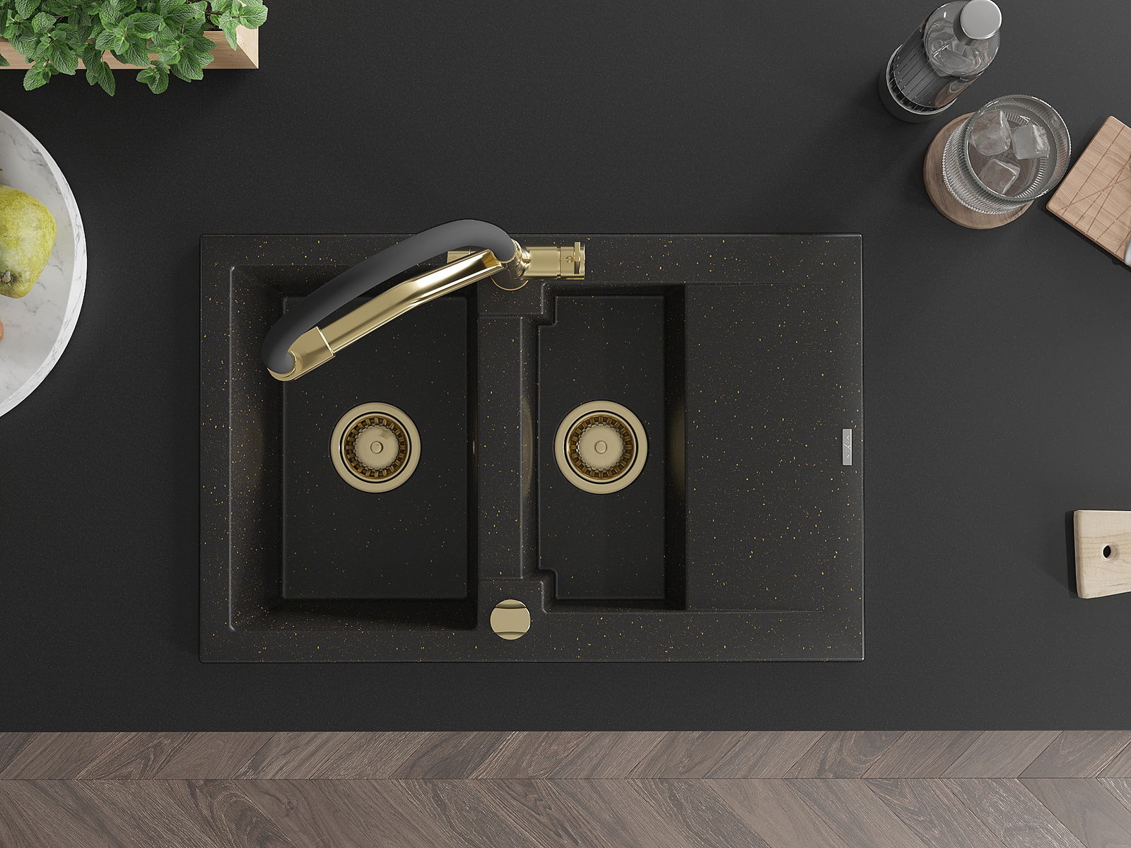 Mexen Gaspar chiuvetă de granit cu 1,5 compartimente cu picurător și baterie de bucătărie Duo, negru/auriu metalizat