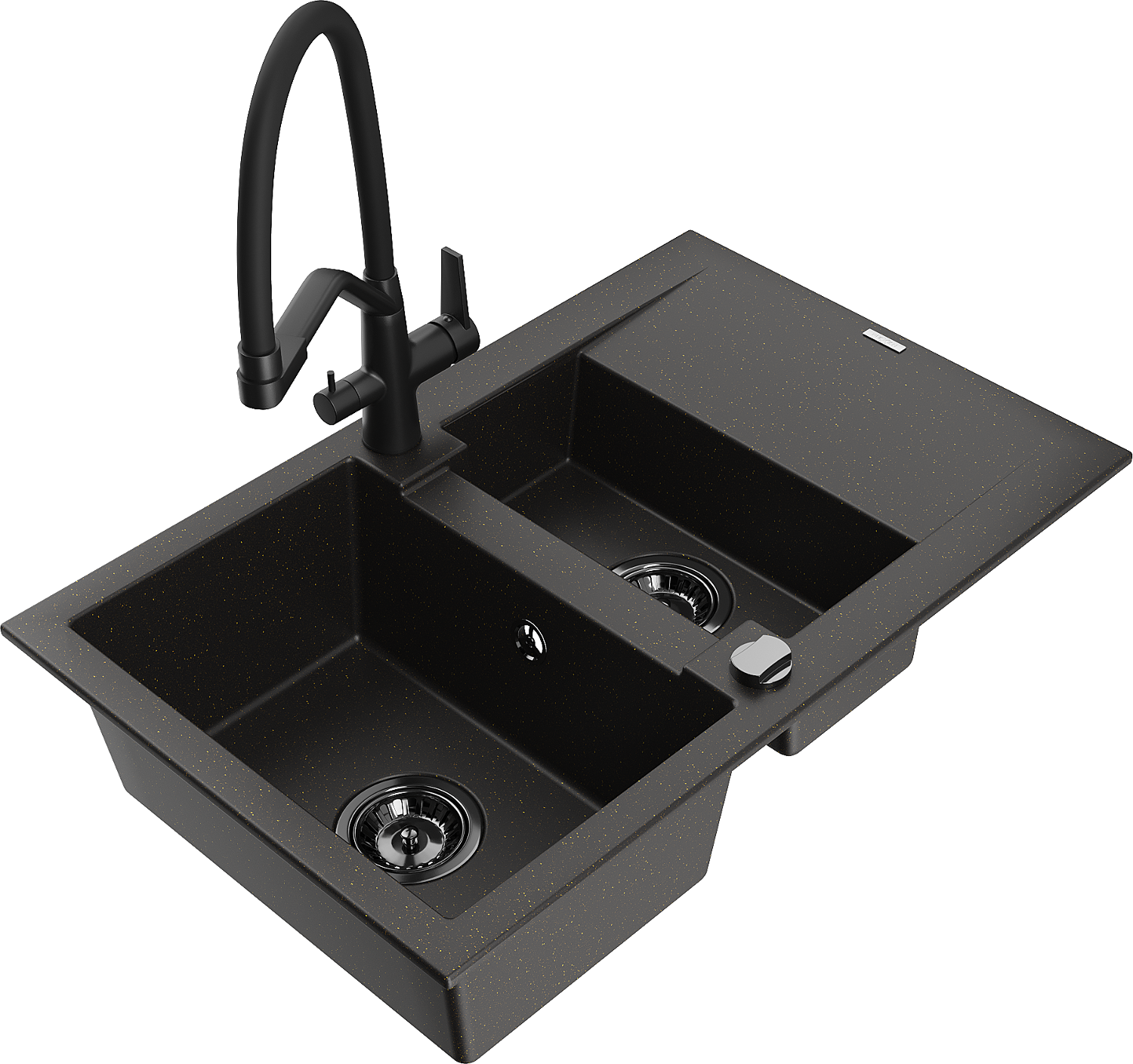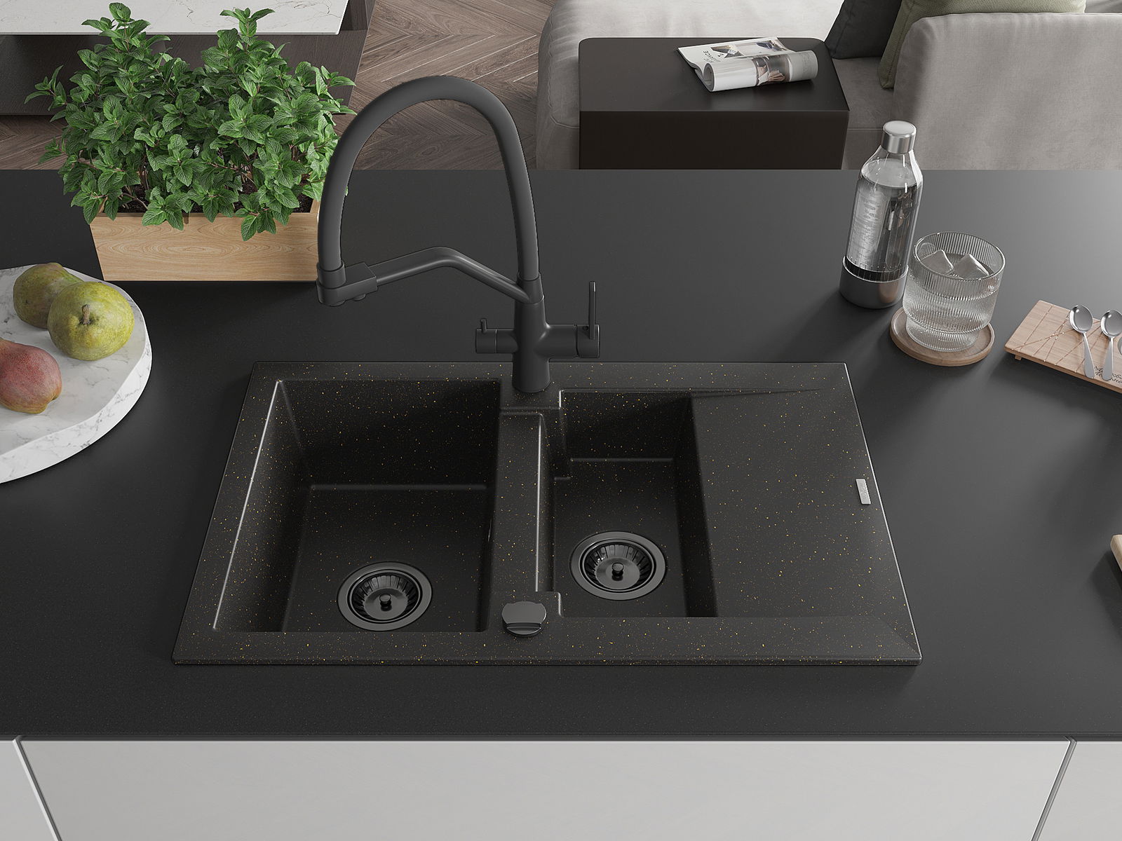Mexen Gaspar chiuvetă de granit cu 1,5 cuve cu picurător și robinet de bucătărie Duo, negru/auriu metalic