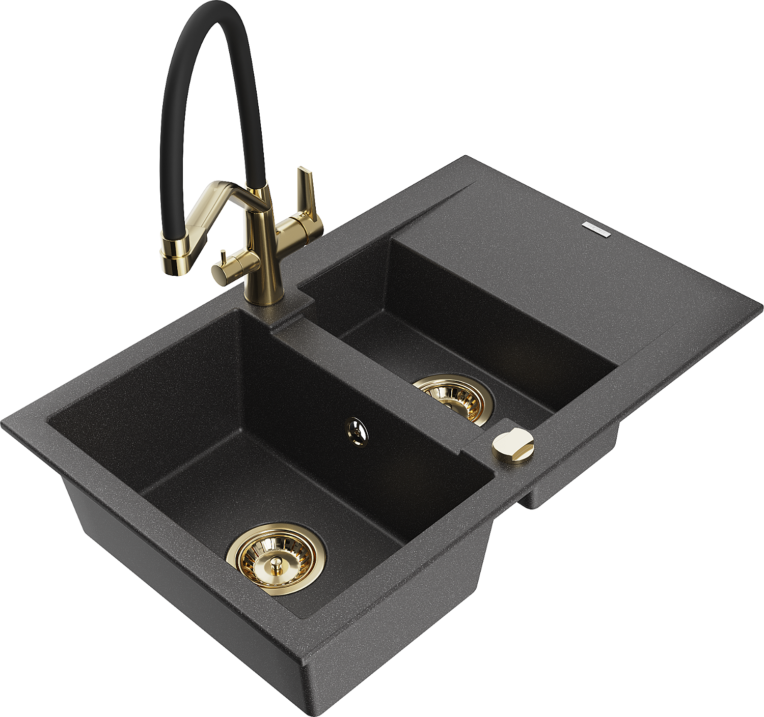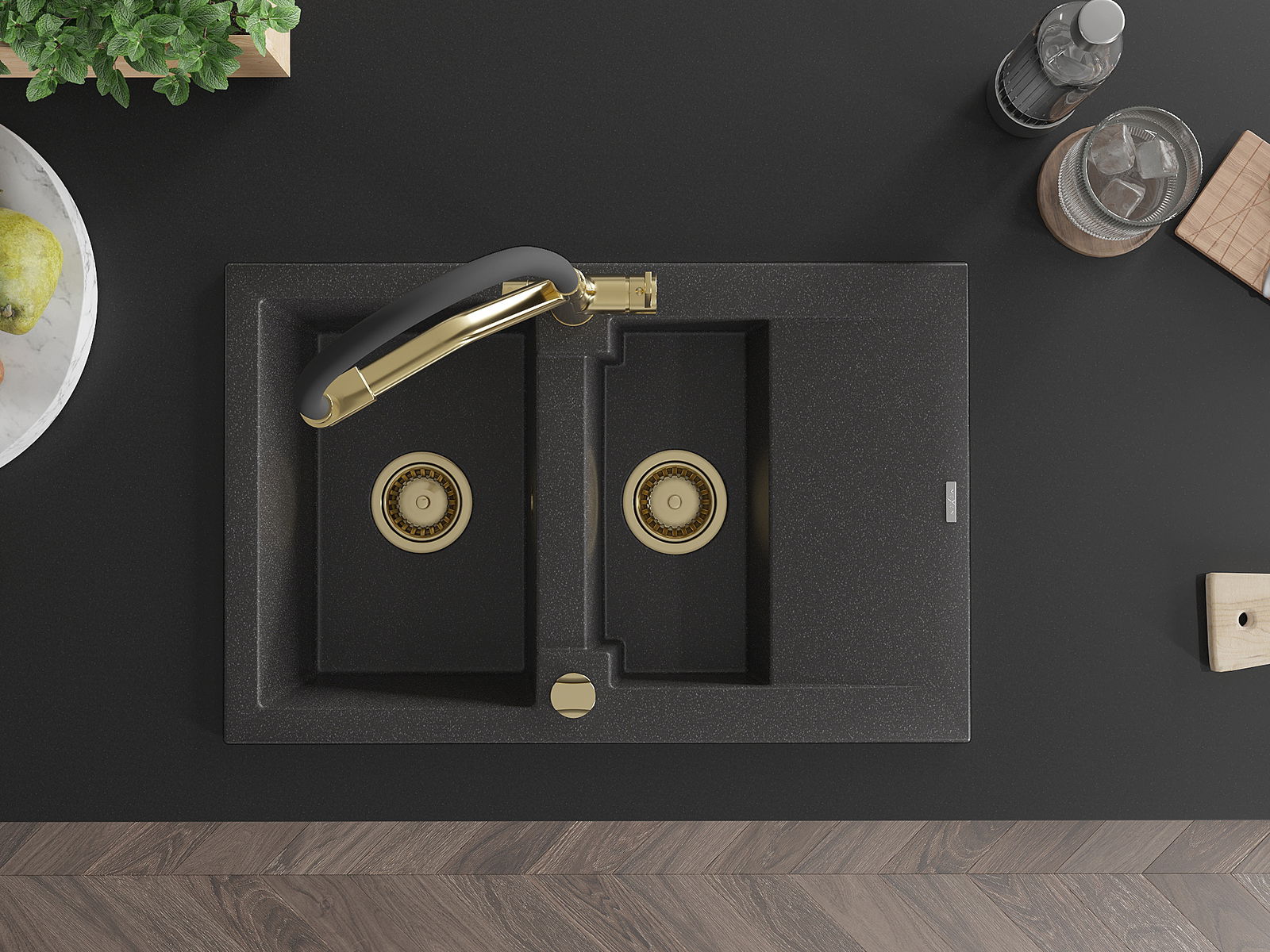 Mexen Gaspar chiuvetă de granit cu 1,5 cuve, cu scurgător și baterie de bucătărie Duo, negru cu pete - 6507-76-671701-57-G