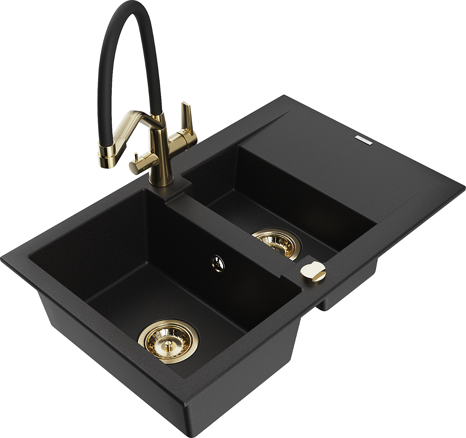 Mexen Gaspar chiuvetă de bucătărie din granit, 1,5 cuve, cu scurgător și baterie Duo, negru - 6507-77-671701-57-G