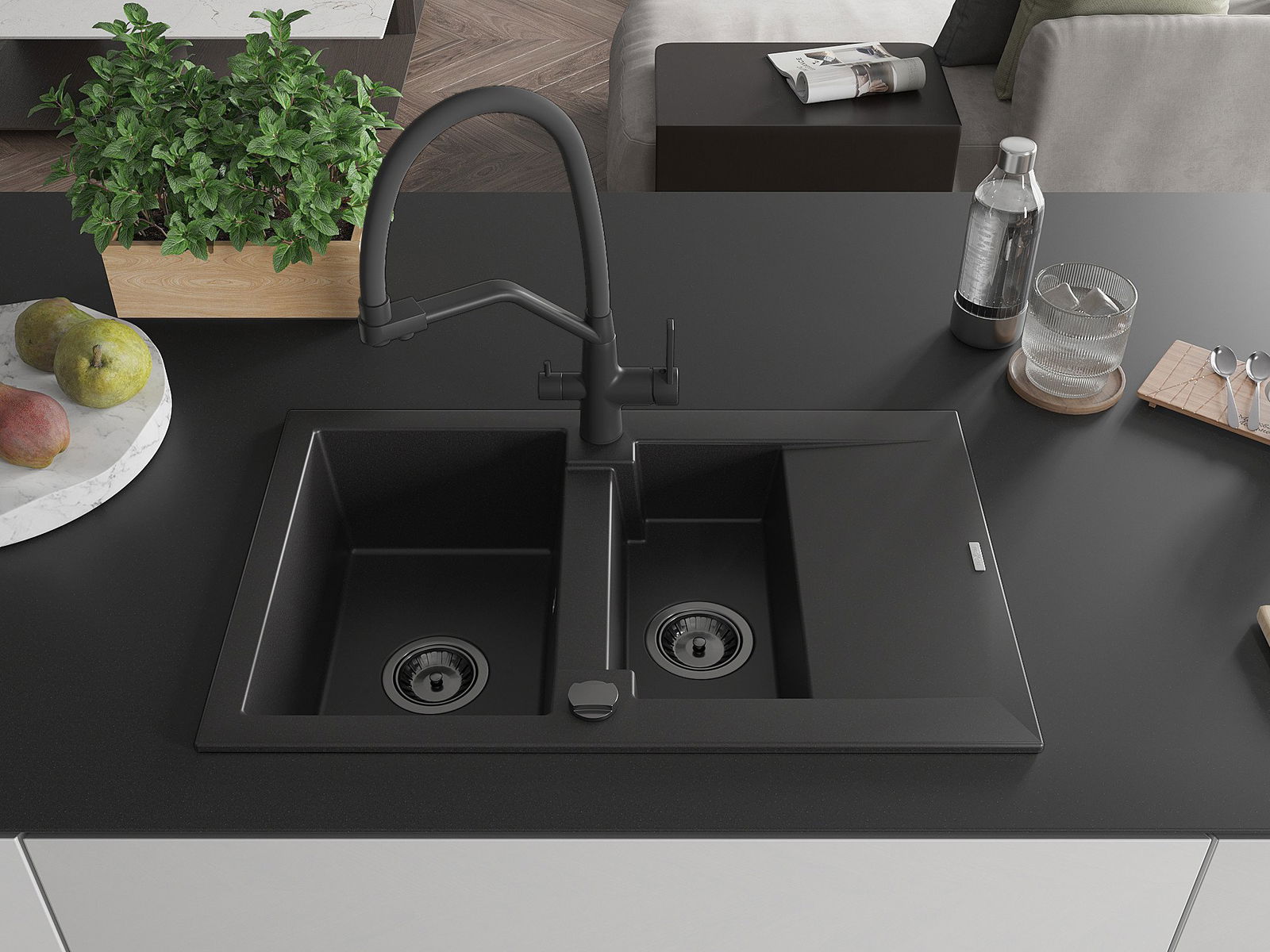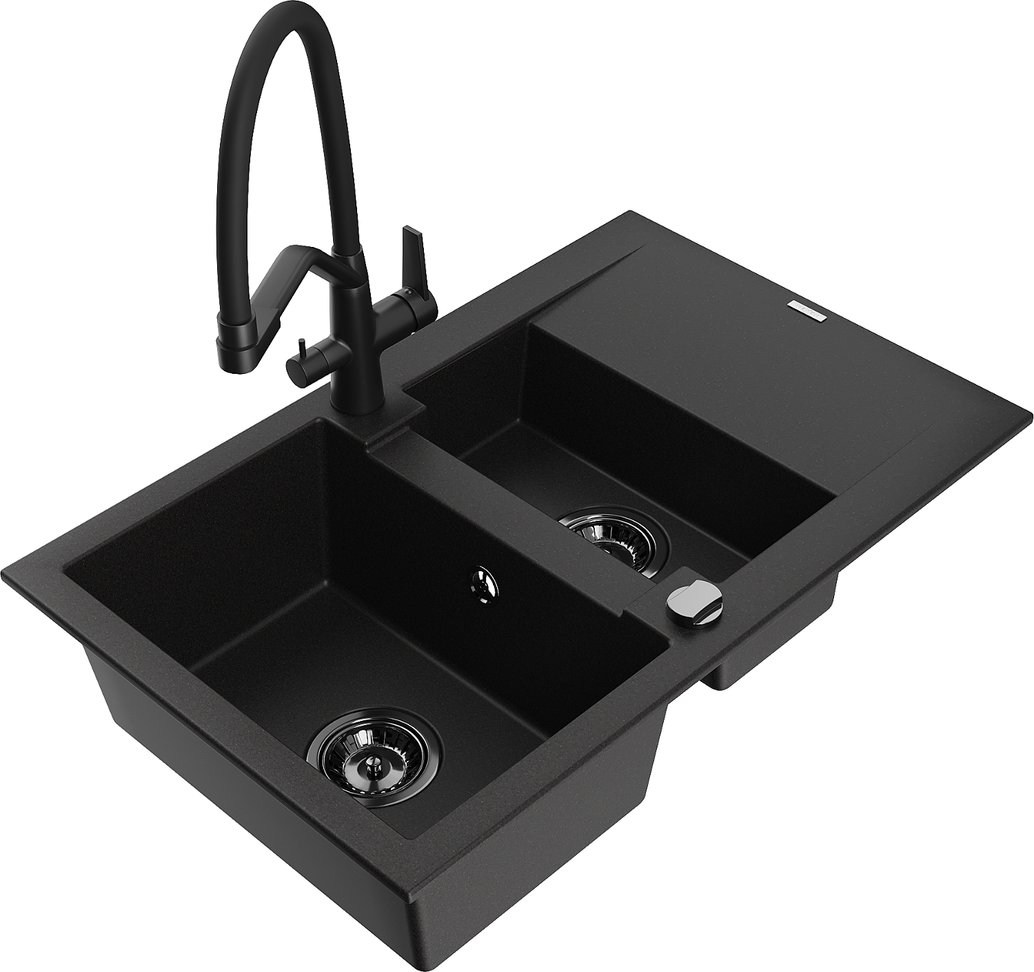 Mexen Gaspar chiuvetă din granit cu 1,5 compartimente cu suport de scurgere și baterie de bucătărie Duo, negru