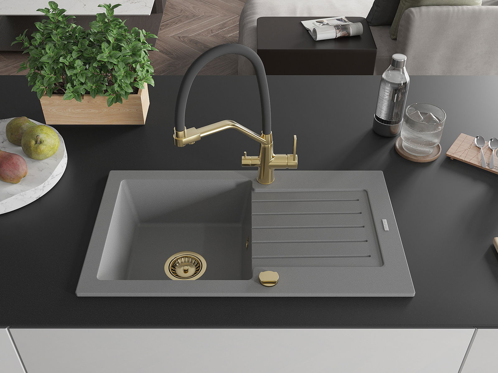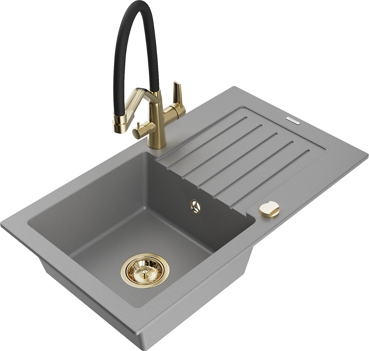Mexen Pablo chiuvetă din granit cu 1 compartiment cu scurgător și baterie de bucătărie Duo, gri - 6510-71-671701-57-G