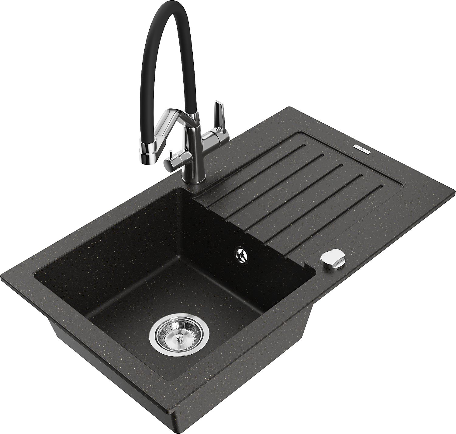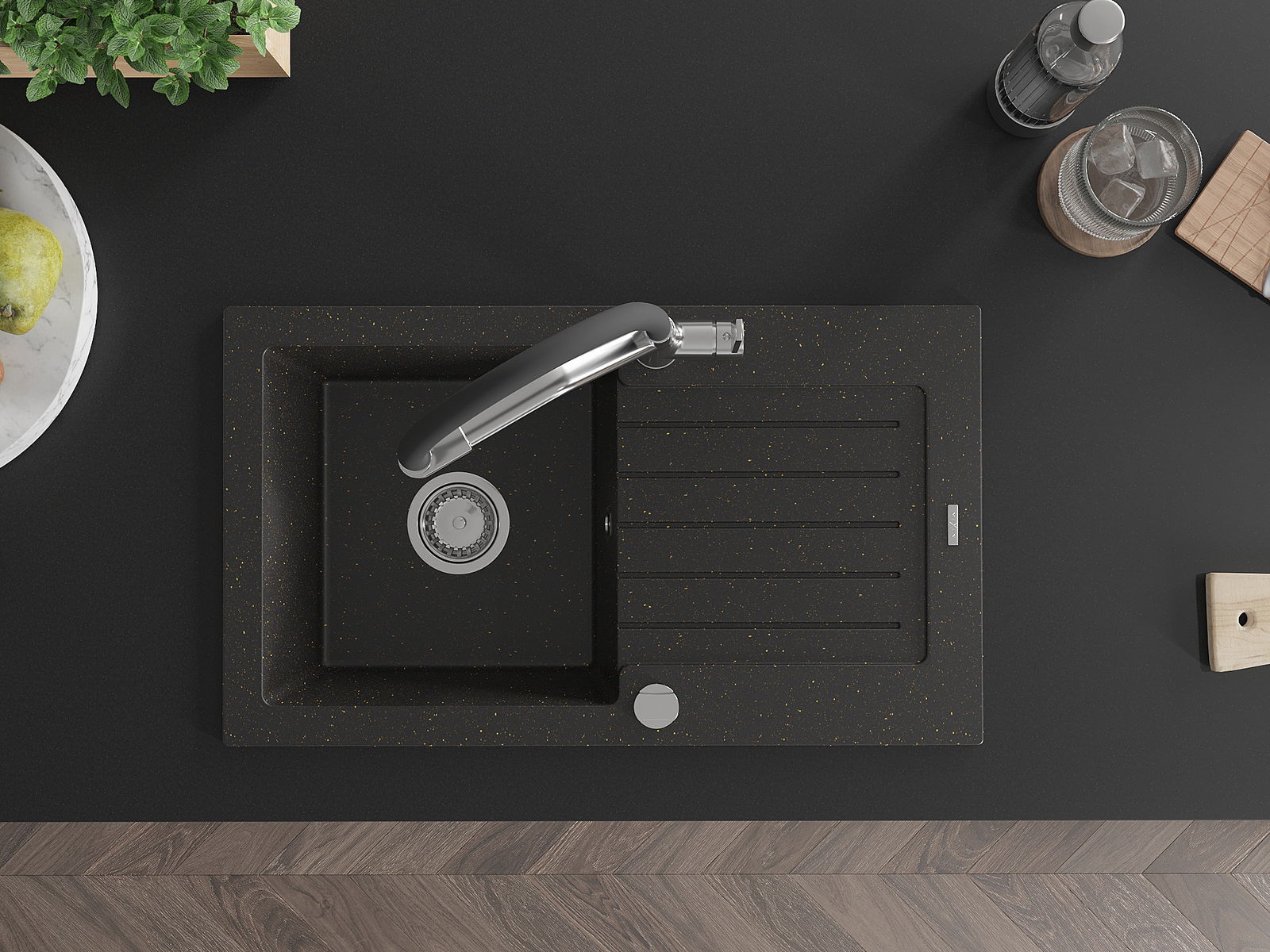 Mexen Pablo chiuvetă de bucătărie din granit cu 1 compartiment, cu scurgător și baterie Duo, negru/auriu metalizat