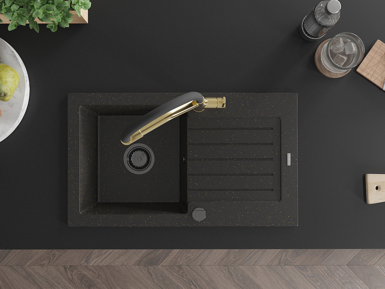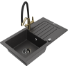 Mexen Pablo chiuvetă de granit cu o cuvă, blat de scurgere și baterie de bucătărie Duo, negru/auriu metalic