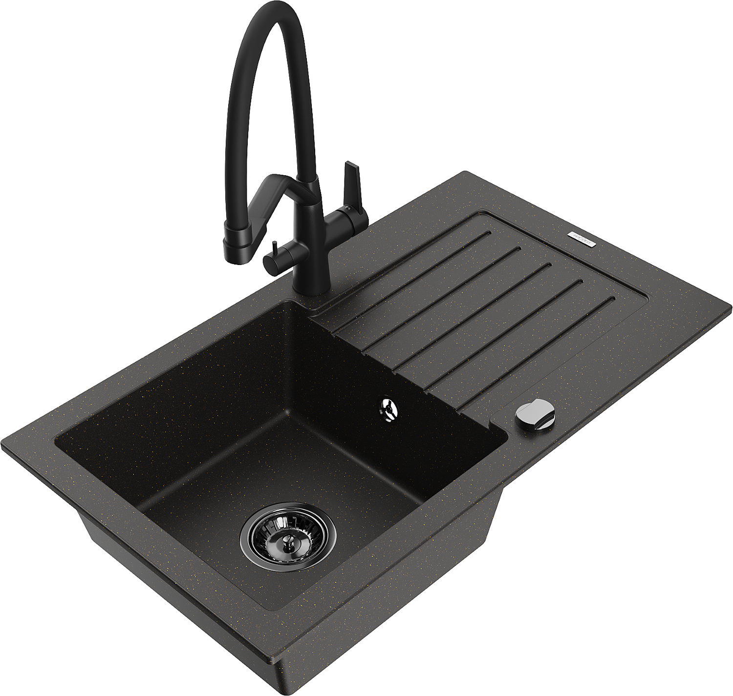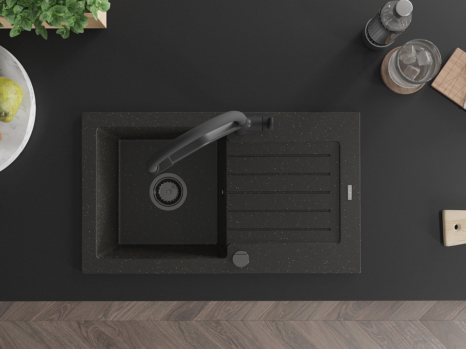 Mexen Pablo chiuvetă de granit cu 1 cuvă cu scurgător și baterie de bucătărie Duo, negru/or metalic - 6510-75-671701-70-B