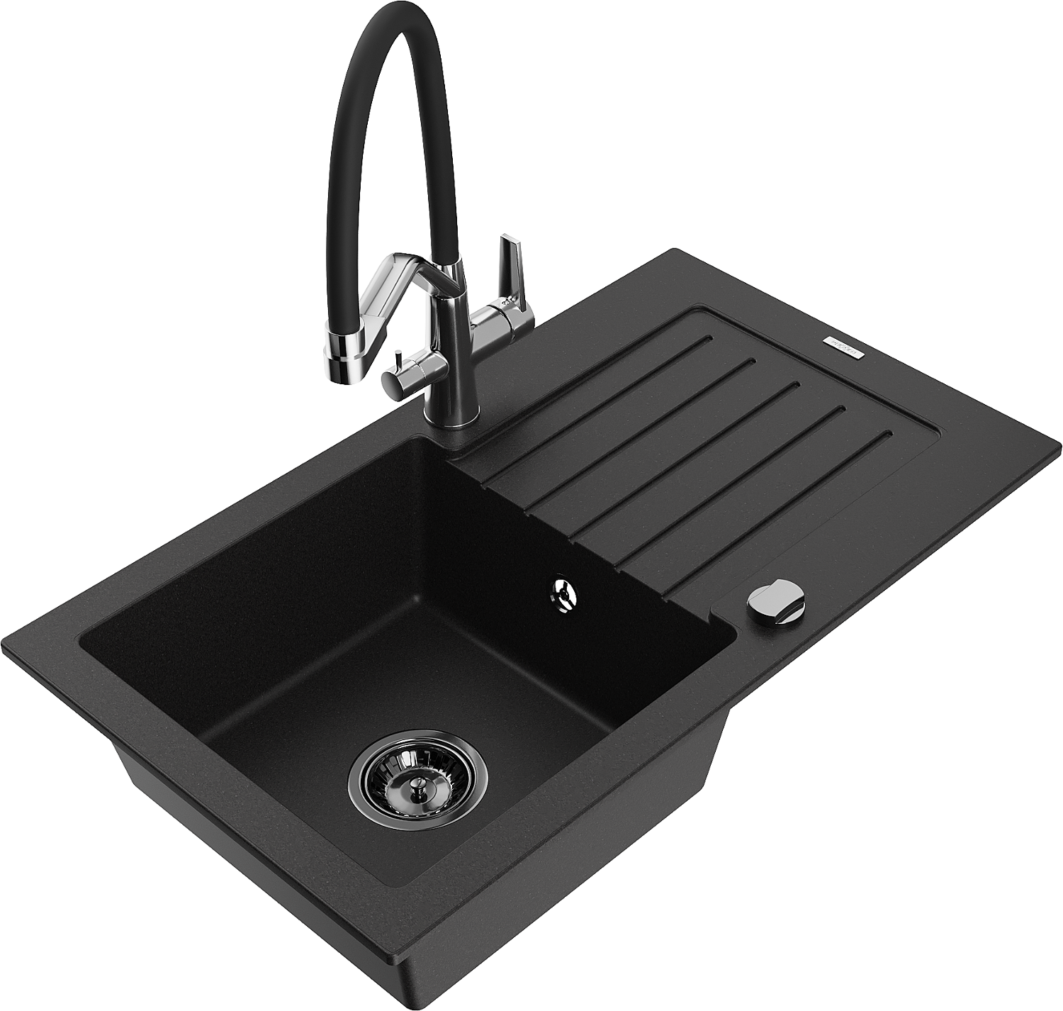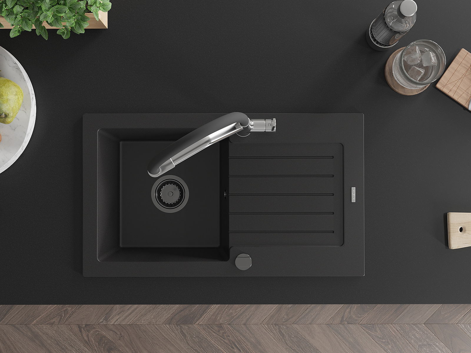 Mexen Pablo chiuvetă de granit cu o singură cuvă și scurgător, cu baterie de bucătărie Duo, negru - 6510-77-671701-07-B