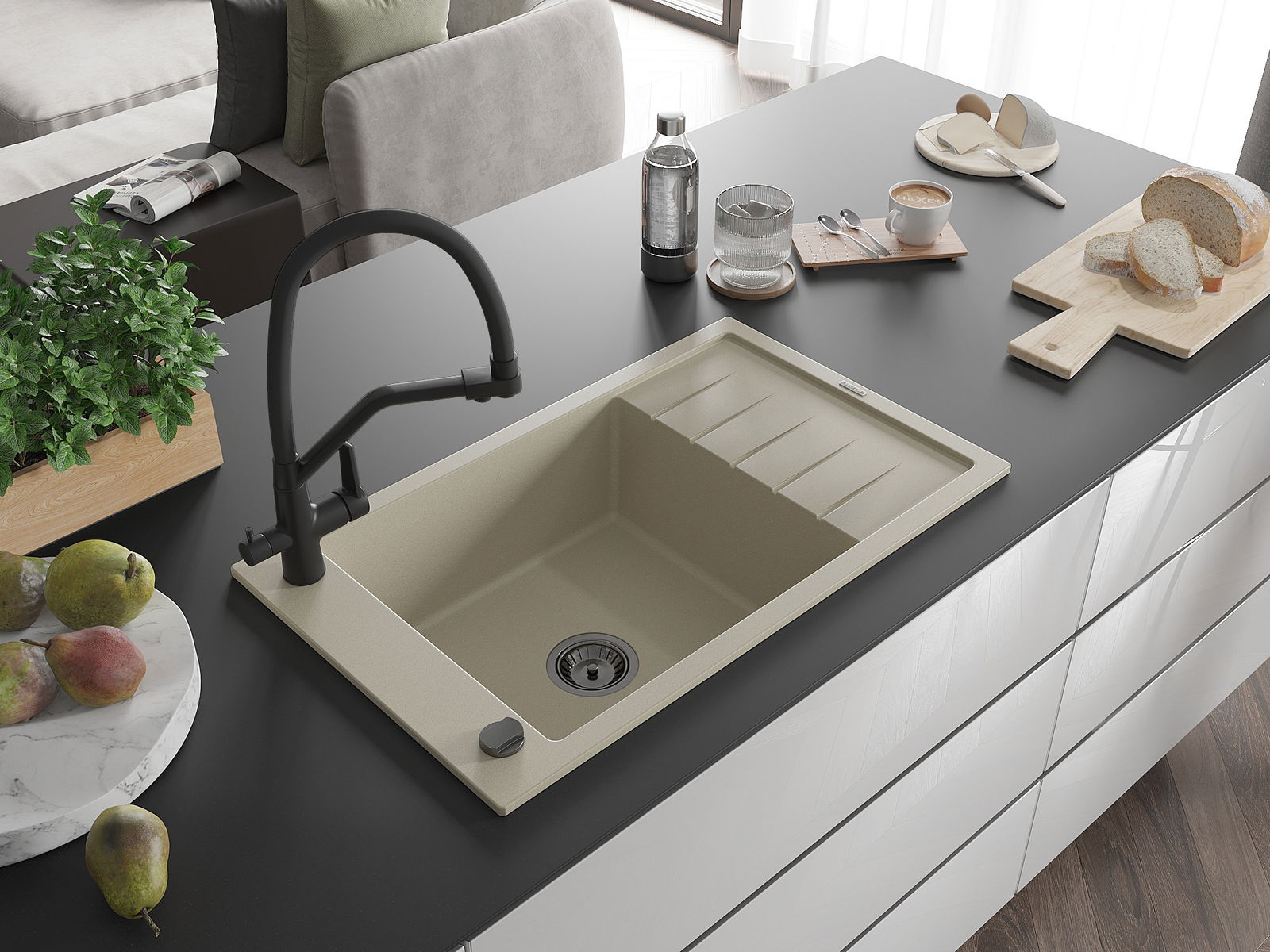 Suprafața chiuvetei este rezistentă la pete și decolorarea, datorită căreia este ușor de curățat și își păstrează culoarea mult timp. Estetică și practic completarea fiecărei bucătării.