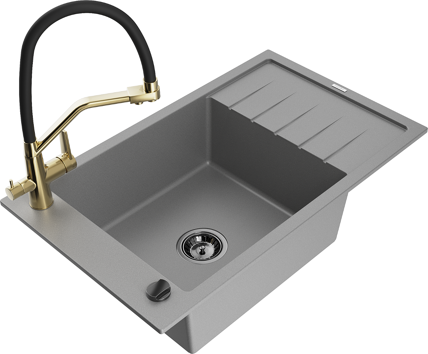 Mexen Elias chiuvetă din granit 1-cameră cu picurător și baterie de bucătărie Duo, gri - 6511-71-671701-57-B