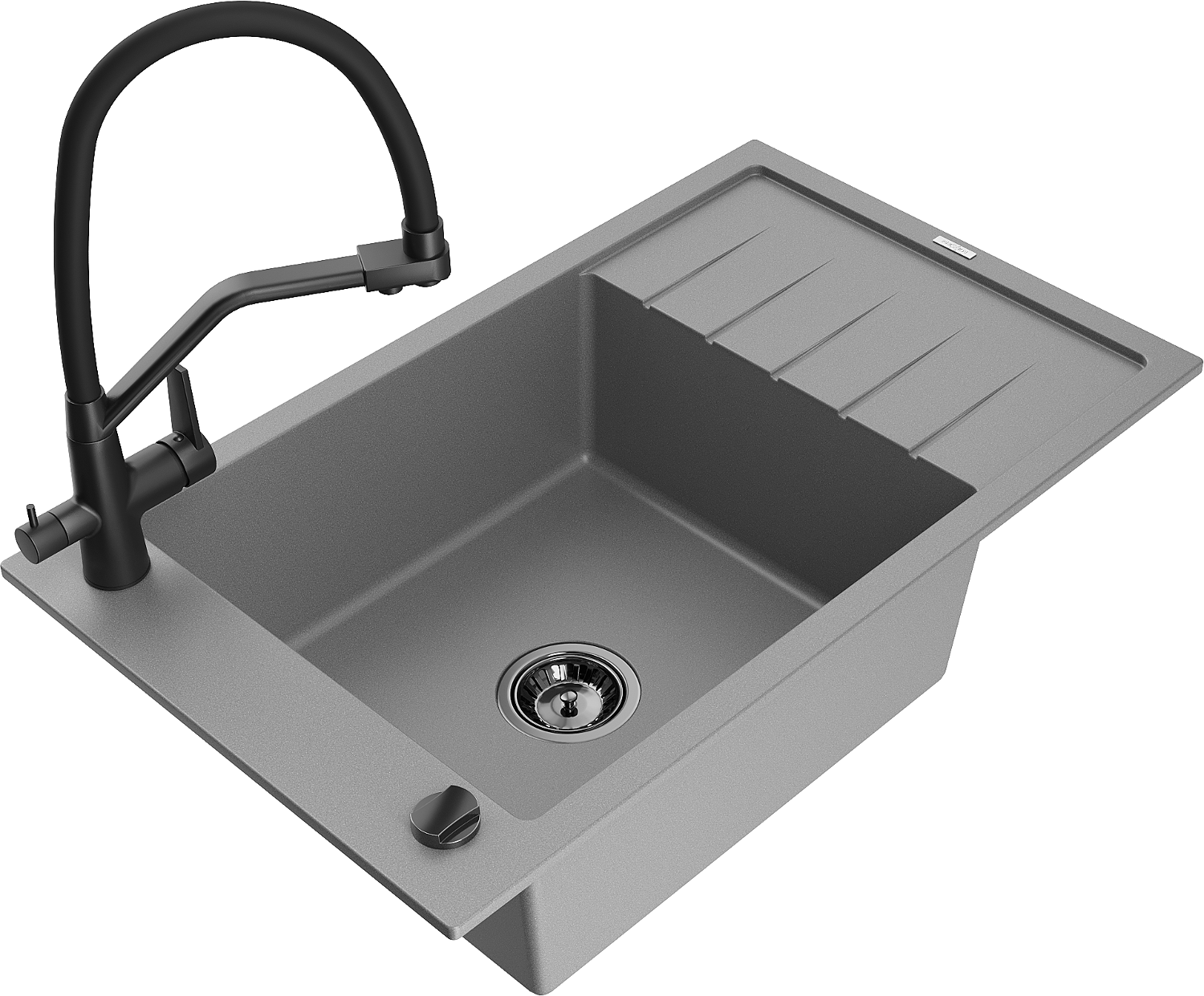 Mexen Elias chiuvetă din granit cu 1 compartiment și scurgător și baterie de bucătărie Duo, gri - 6511-71-671701-70-B