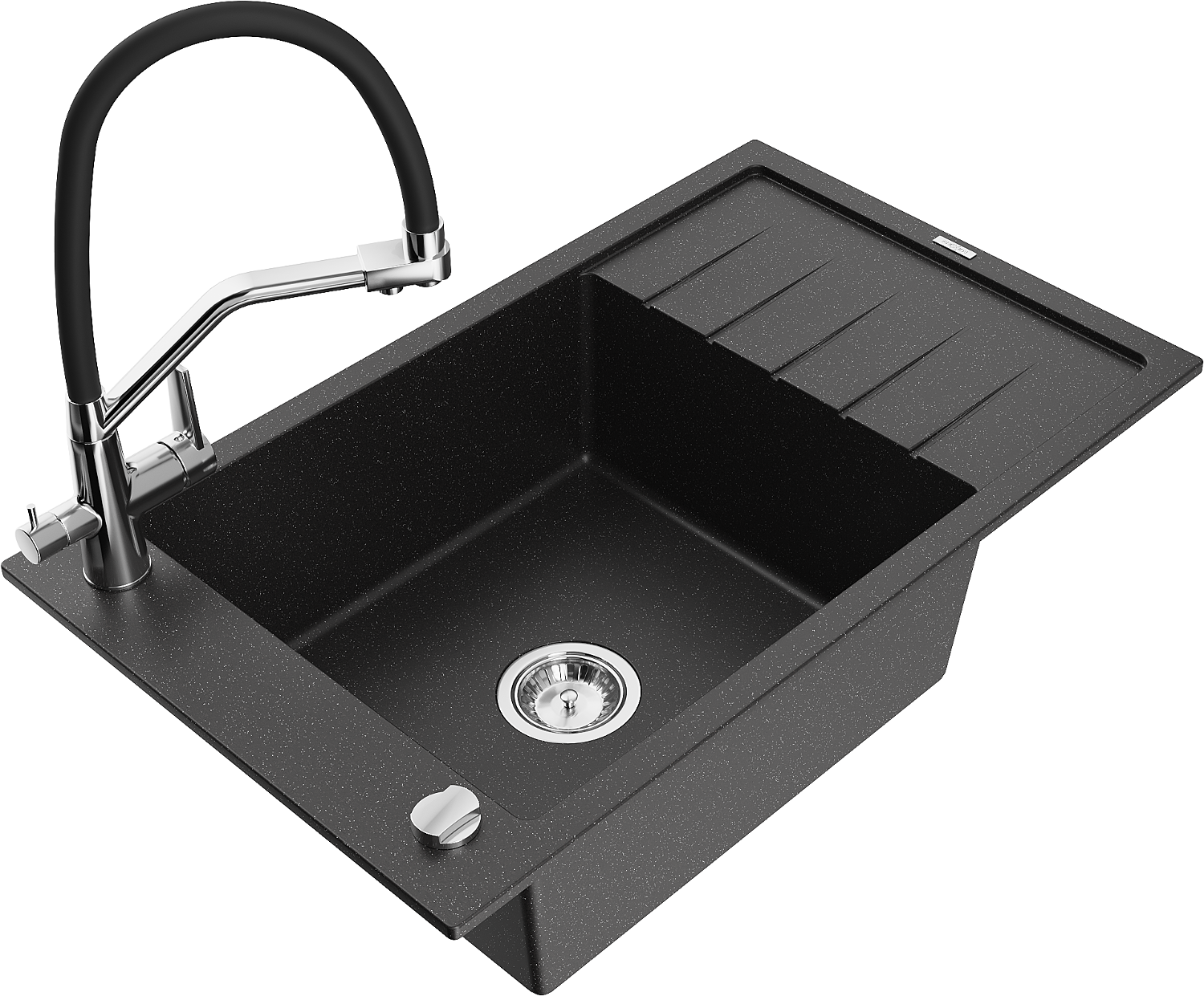 Mexen Elias chiuvetă de granit cu o cuvă, cu picurător și baterie de bucătărie Duo, negru/argintiu metalic