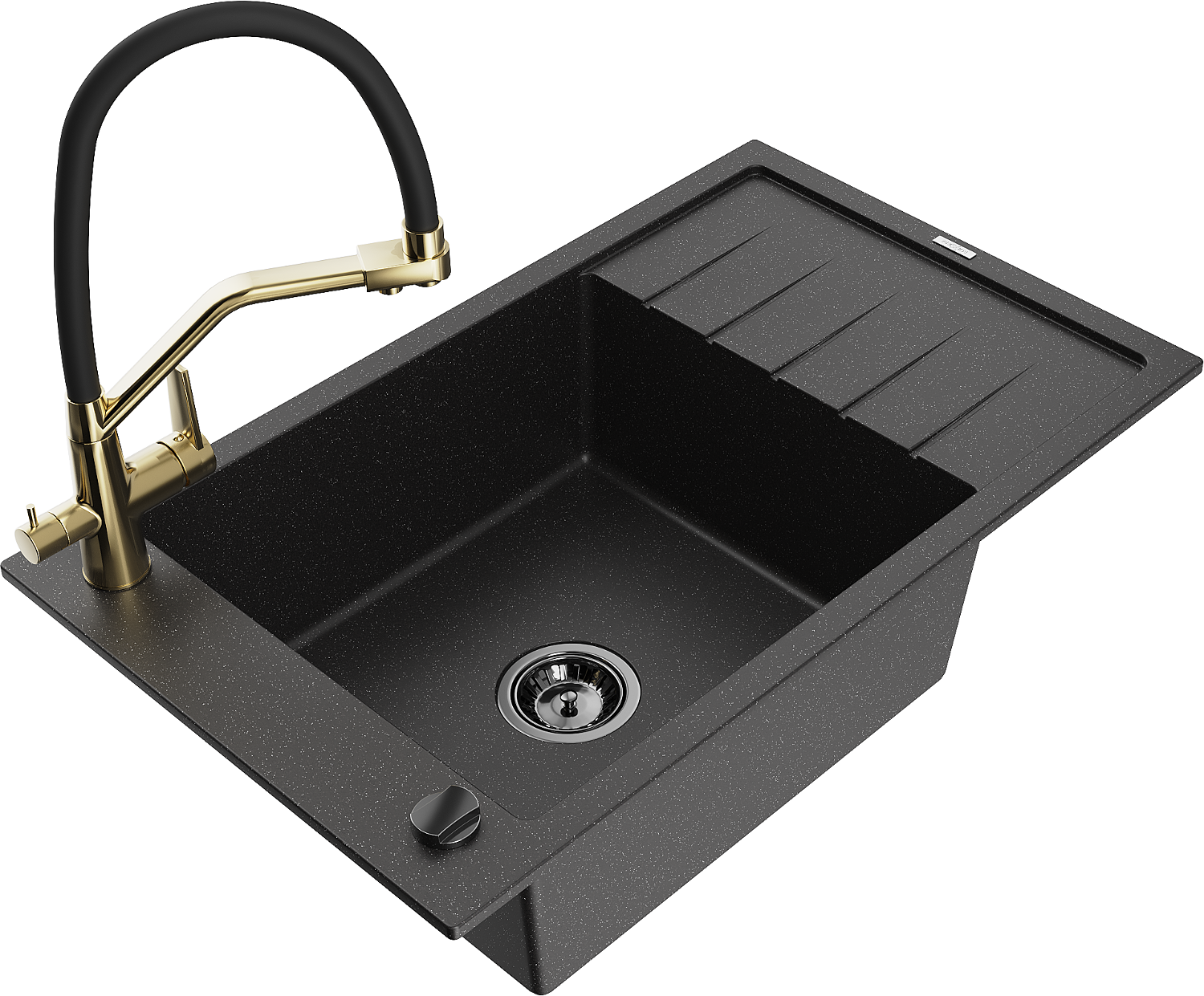 Mexen Elias chiuvetă de granit cu 1 cuvă, cu scurgător și baterie de bucătărie Duo, negru/argintiu metalic