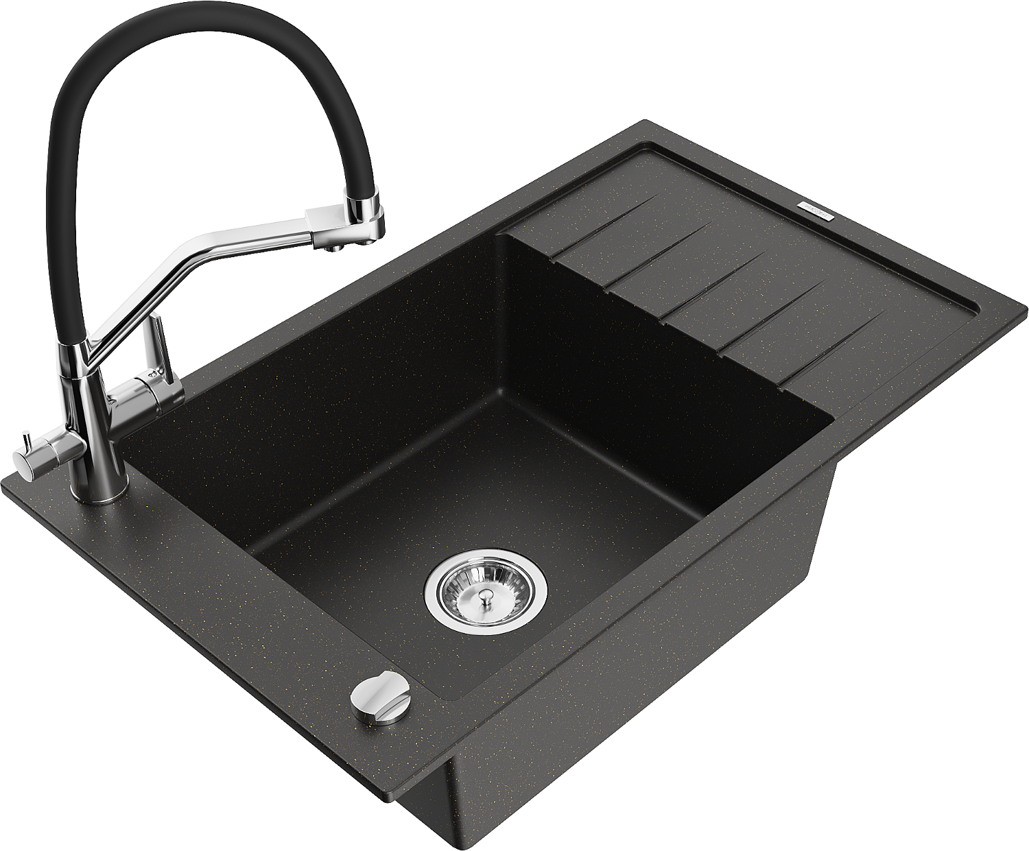 Mexen Elias chiuvetă de bucătărie din granit cu 1 cuvă cu scurgător și baterie Duo, negru/auriu metalizat - 6511-75-671701-07