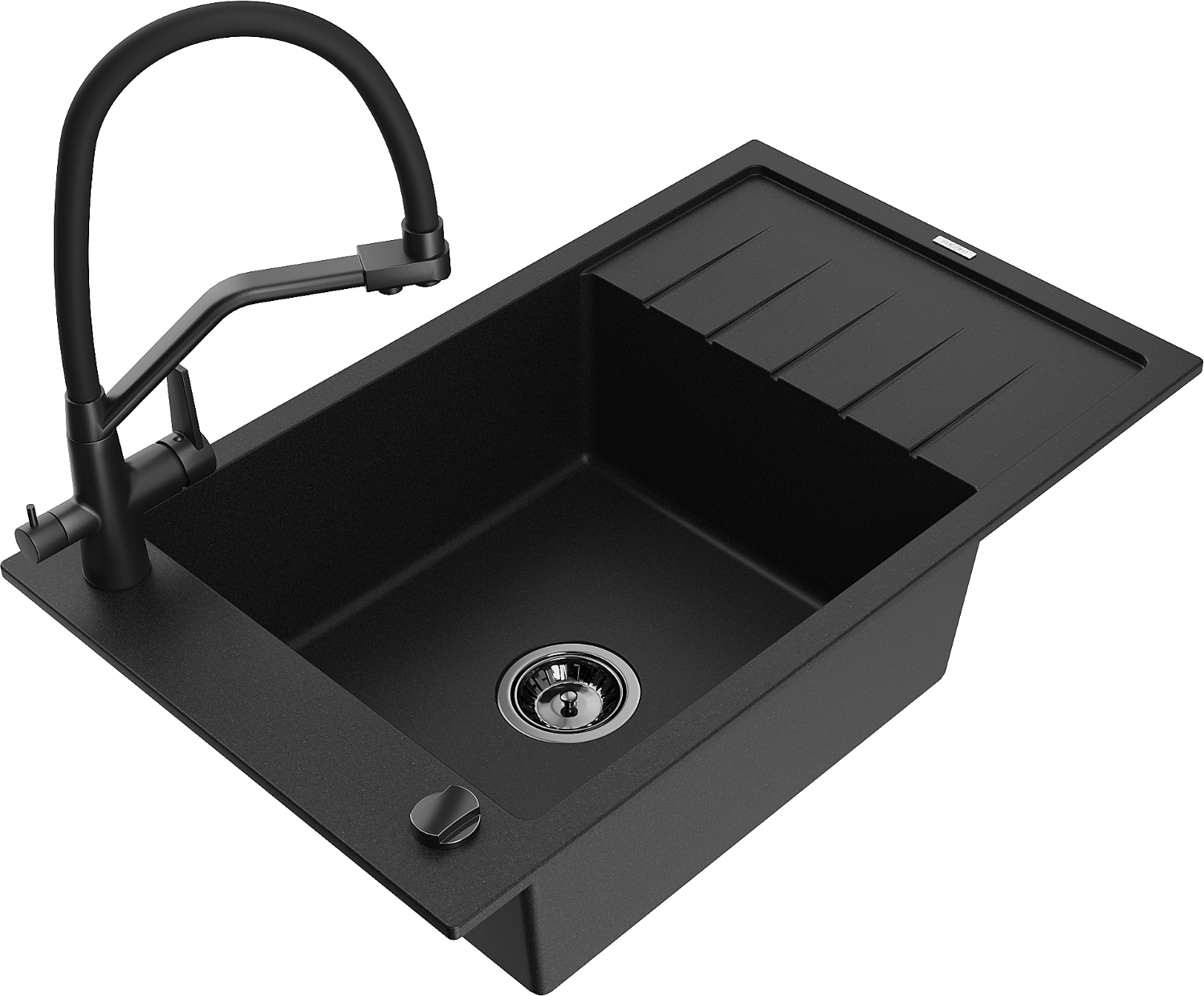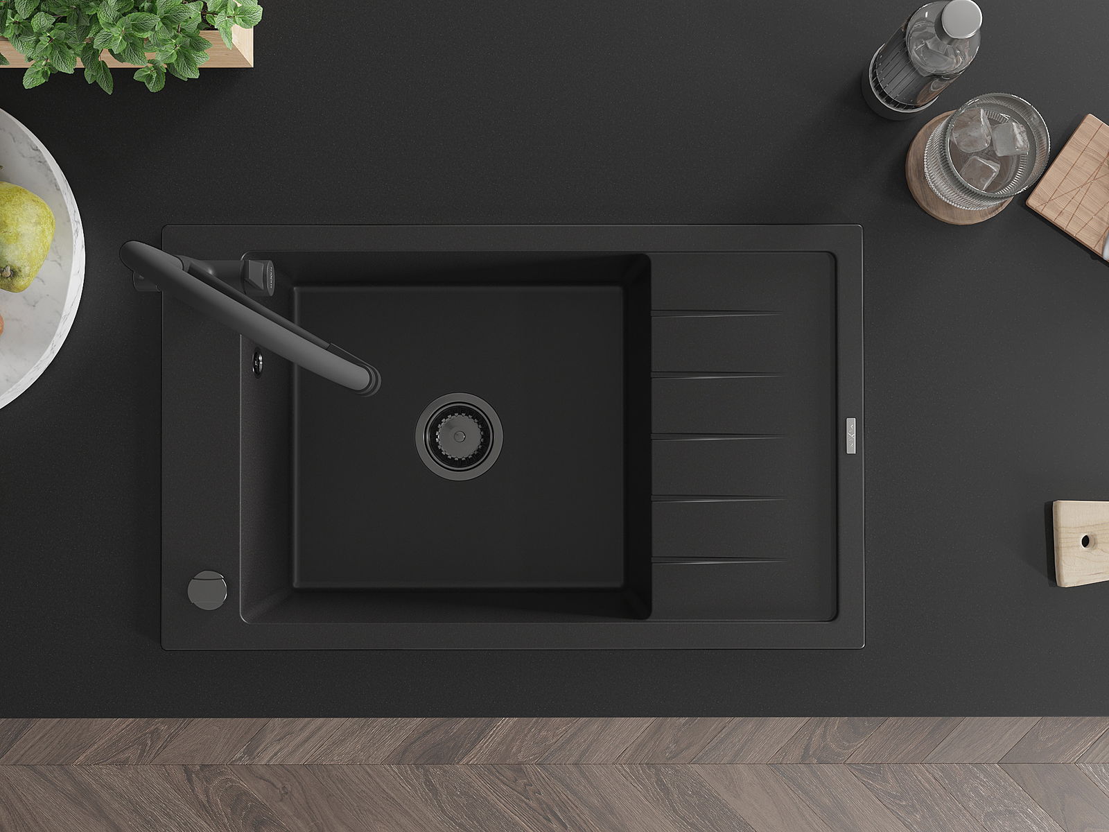Mexen Elias chiuvetă de granit cu 1 compartiment cu scurgător și baterie de bucătărie Duo, negru - 6511-77-671701-70-B