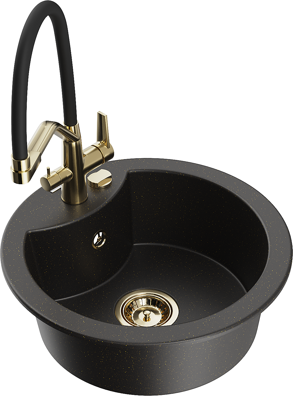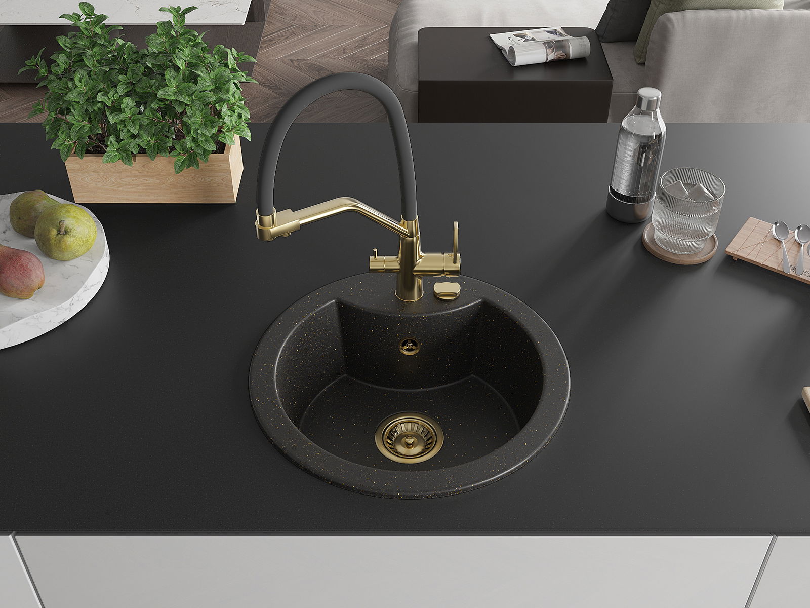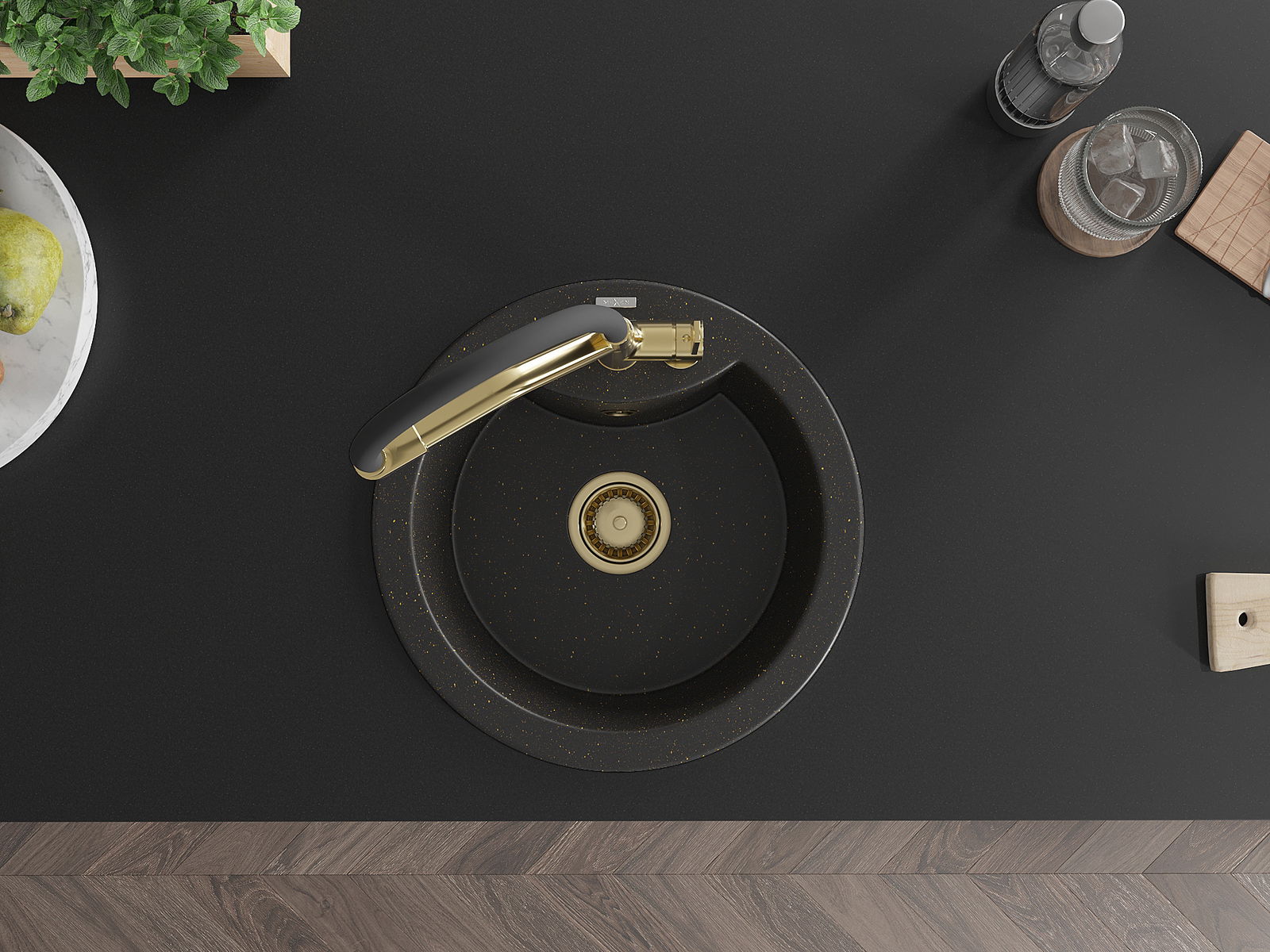 Mexen Diego chiuvetă de granit cu 1 compartiment și baterie de bucătărie Duo, negru/auriu metalizat - 6512-75-671701-57-G