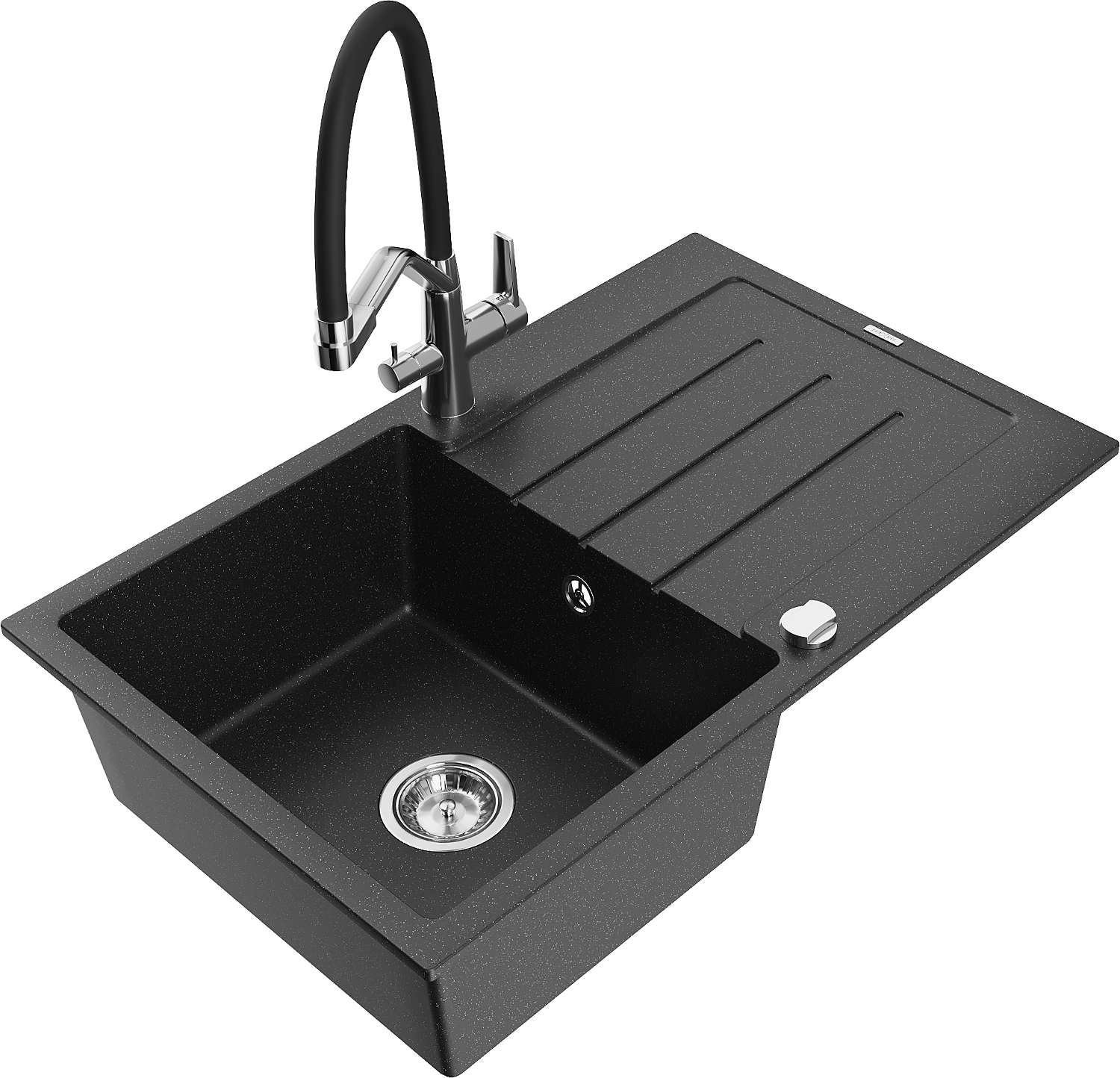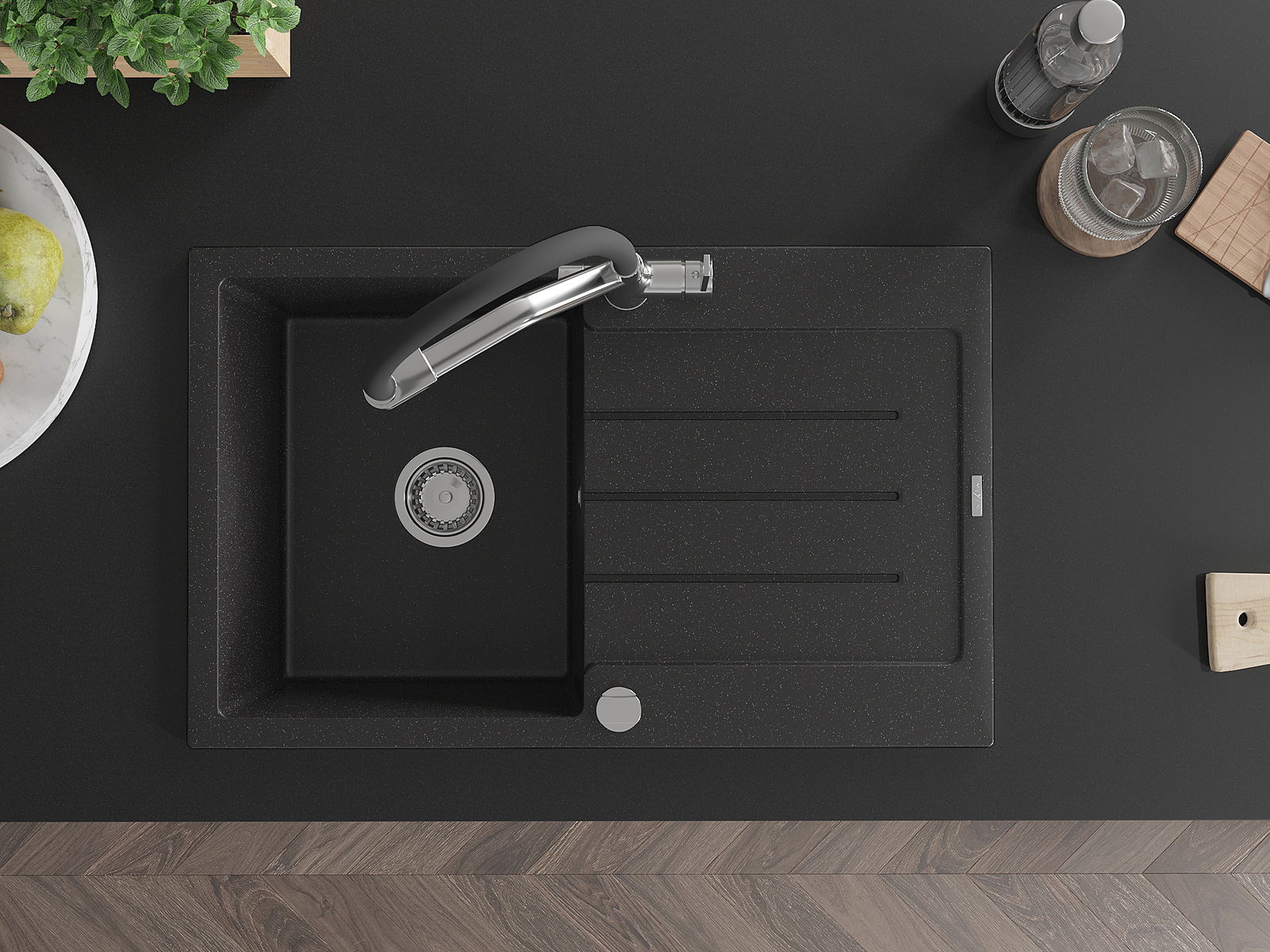 Mexen Bruno chiuvetă de granit cu 1 compartiment cu scurgător și baterie de bucătărie Duo, negru/argintiu metalic