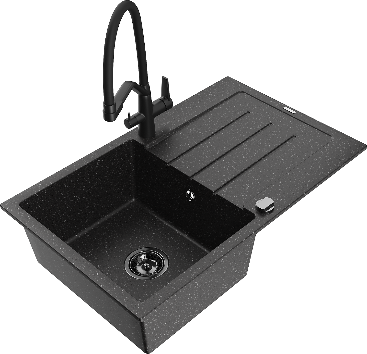 Mexen Bruno chiuvetă de granit cu 1 cuvă cu picurător și baterie de bucătărie Duo, metalic negru/argintiu