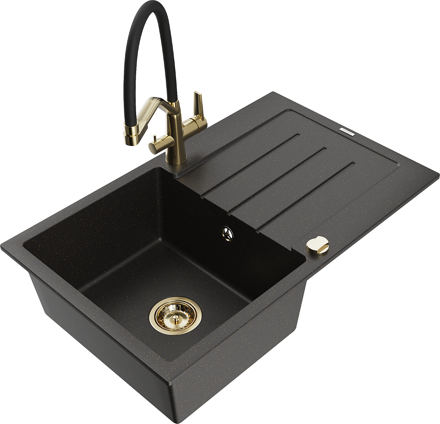 Mexen Bruno chiuvetă granit 1-cameră cu picurător și baterie de bucătărie Duo, negru/auriu metalic - 6513-75-671701-57-G