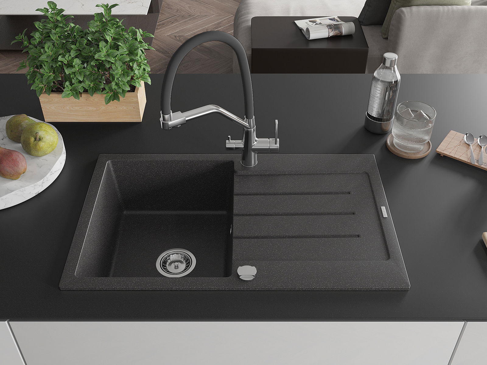 Suprafața chiuvetei este rezistentă la pete și decolorarea, datorită căreia este ușor de curățat și își păstrează culoarea mult timp. Estetică și practic completarea fiecărei bucătării.