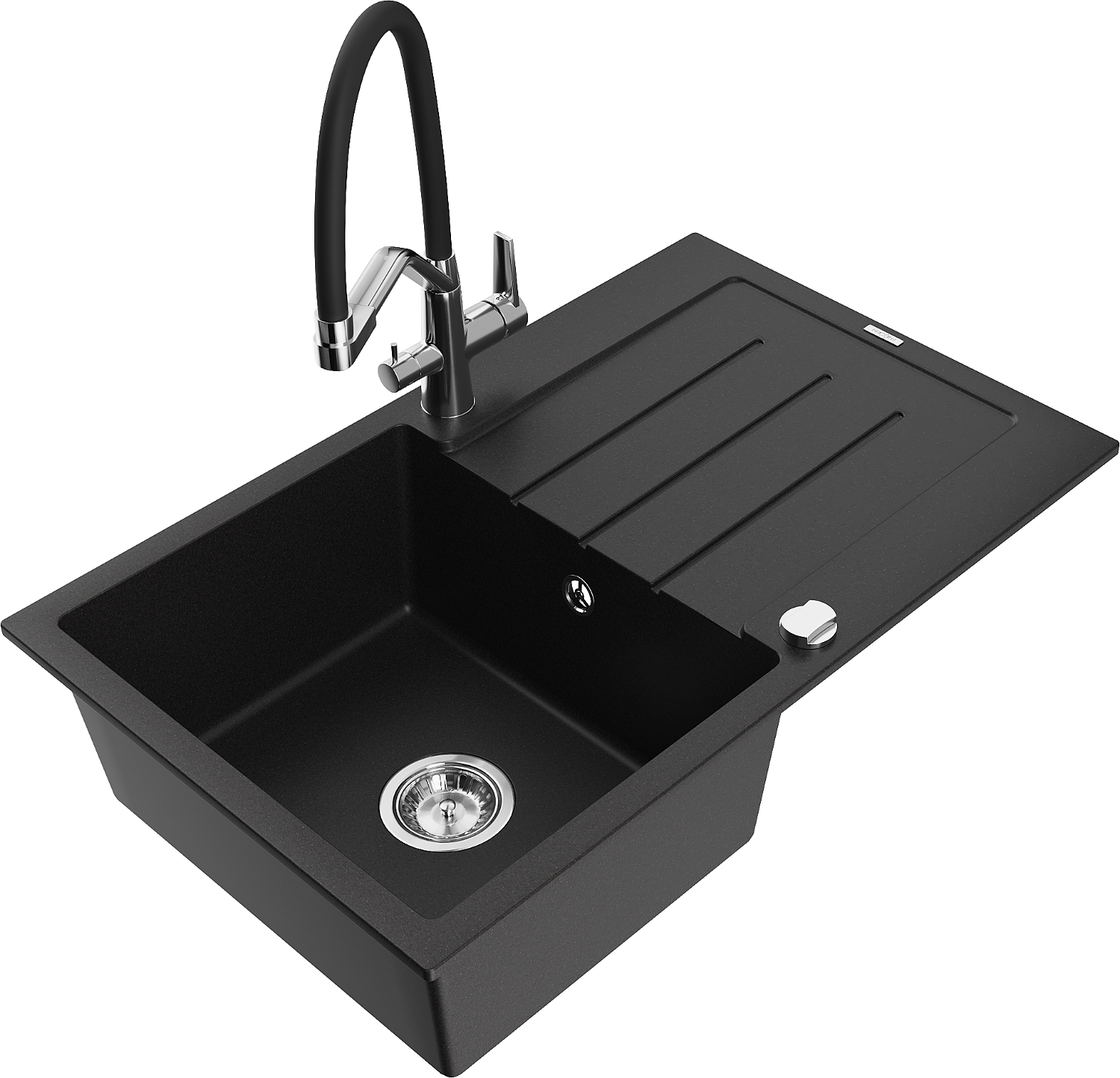 Mexen Bruno chiuvetă de granit cu 1 compartiment, cu scurgător și baterie de bucătărie Duo, neagră - 6513-77-671701-07