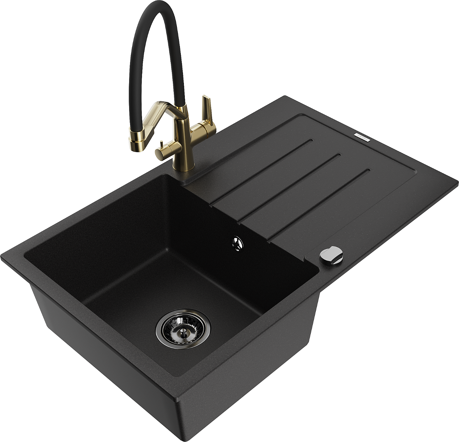 Mexen Bruno chiuvetă din granit cu 1 compartiment cu scurgător și baterie de bucătărie Duo, negru - 6513-77-671701-57-B