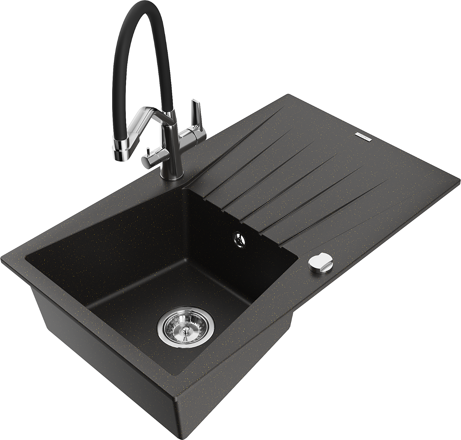 Mexen Cesar chiuvetă din granit cu o singură cuvă, cu scurgător și baterie de bucătărie Duo, negru/auriu metalic