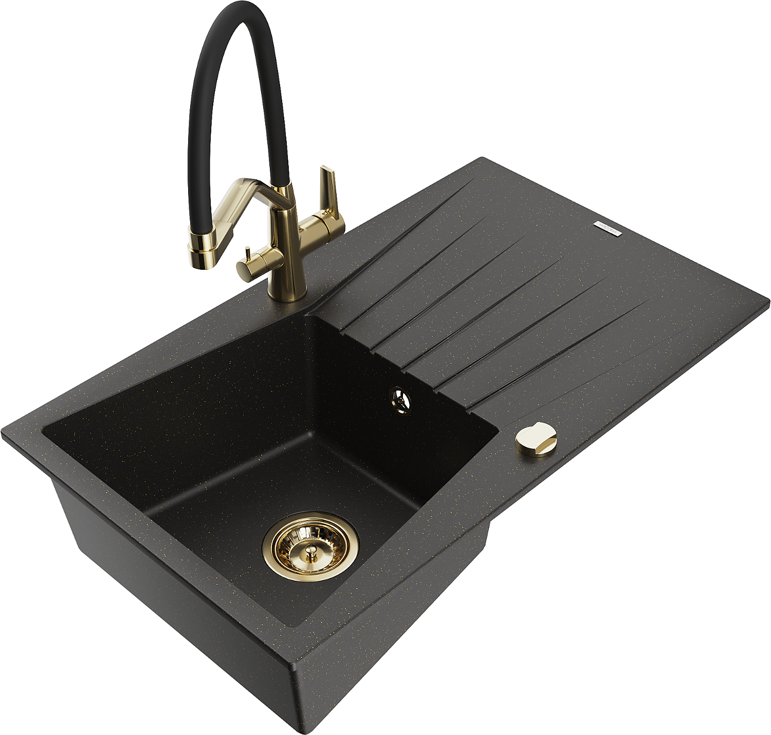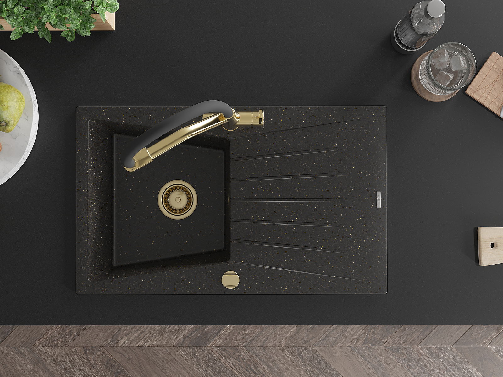 Mexen Cesar chiuvetă de granit cu o singură cuvă, cu scurgător și baterie de bucătărie Duo, negru/auriu metalizat