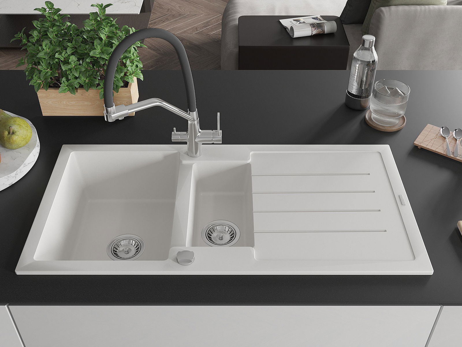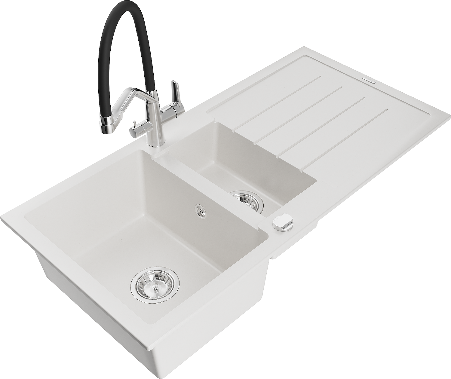 Mexen Andres chiuvetă granit 1,5 camere cu scurgător și baterie bucătărie Duo, alb - 6515-20-671701-07