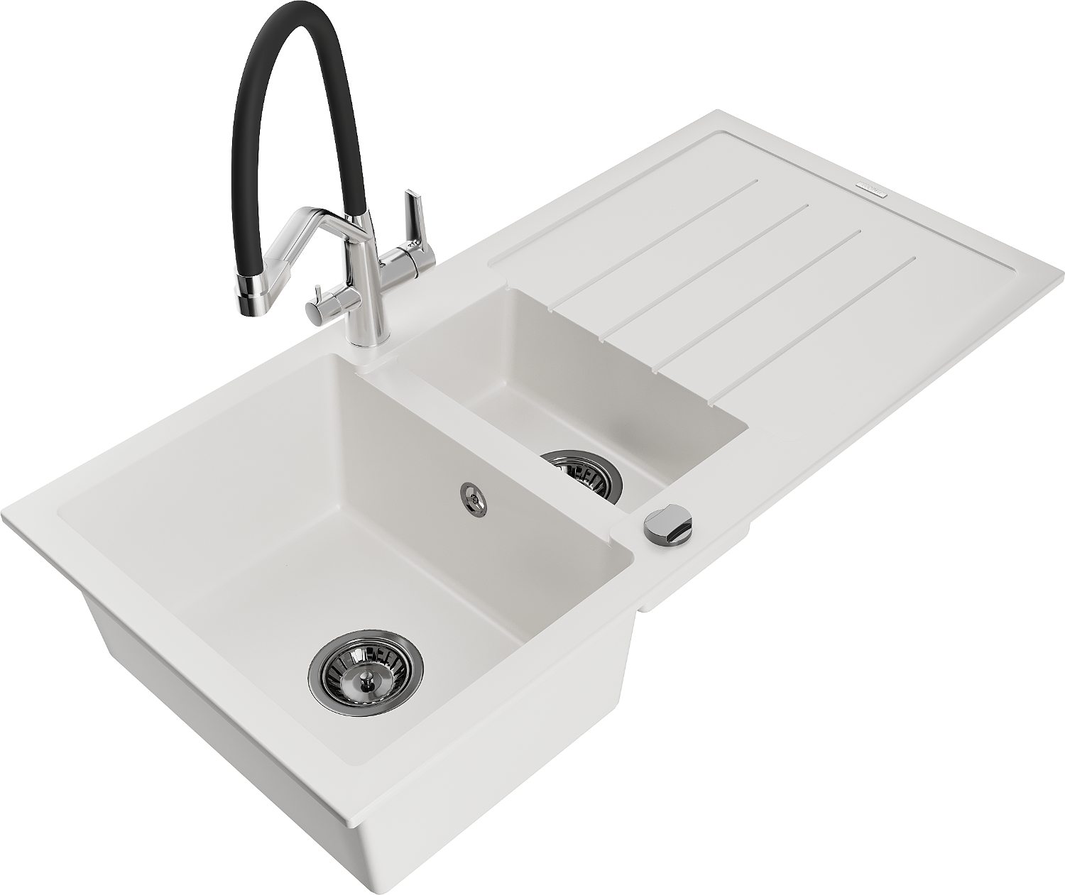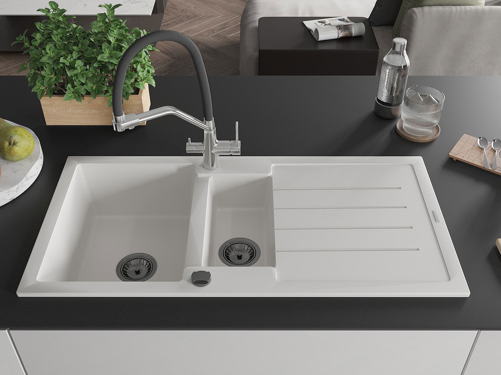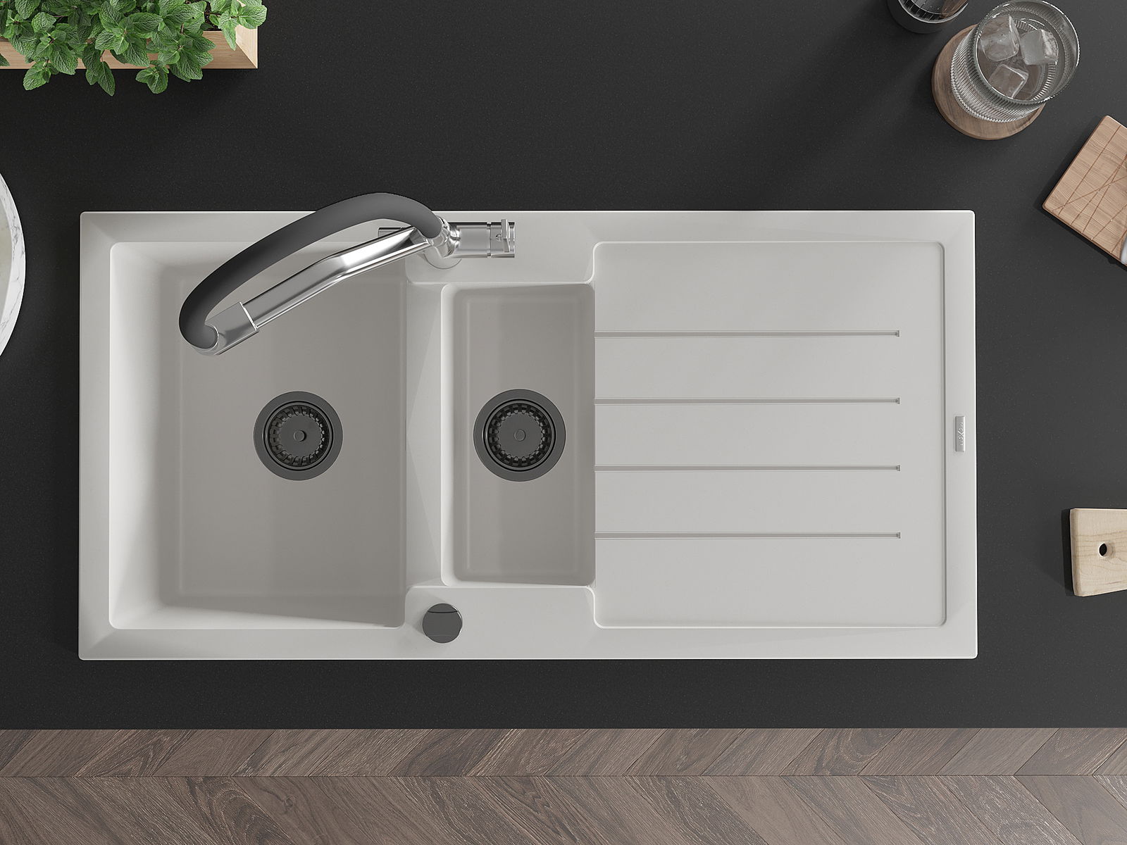 Mexen Andres chiuvetă din granit cu 1,5 compartimente cu scurgător și baterie de bucătărie Duo, alb - 6515-20-671701-07-B